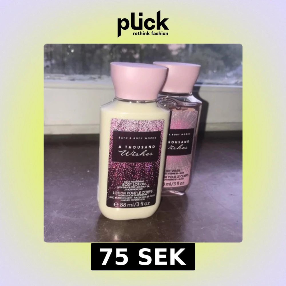 Set med body lotion och body wash från Bath & Body Works i doften A Thousand Wishes. Båda flaskorna är 88 ml och har rosa lock och glittriga etiketter. Lotionen är krämig och vit, duschkrämen är ljusrosa och genomskinlig. Perfekt storlek för resan eller gymväskan.