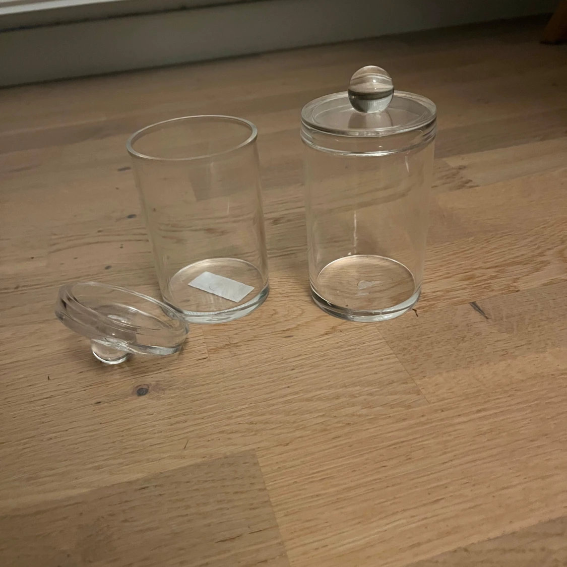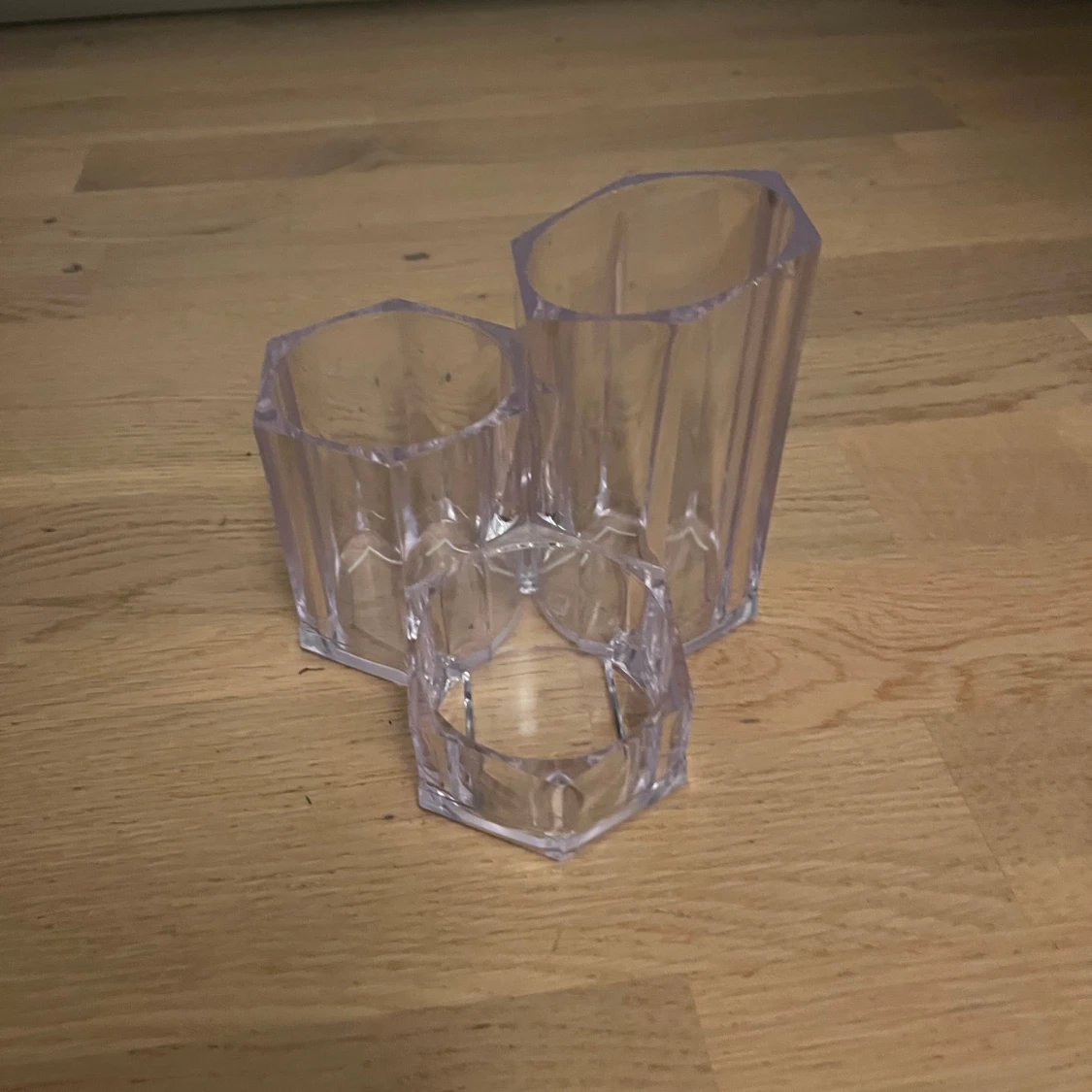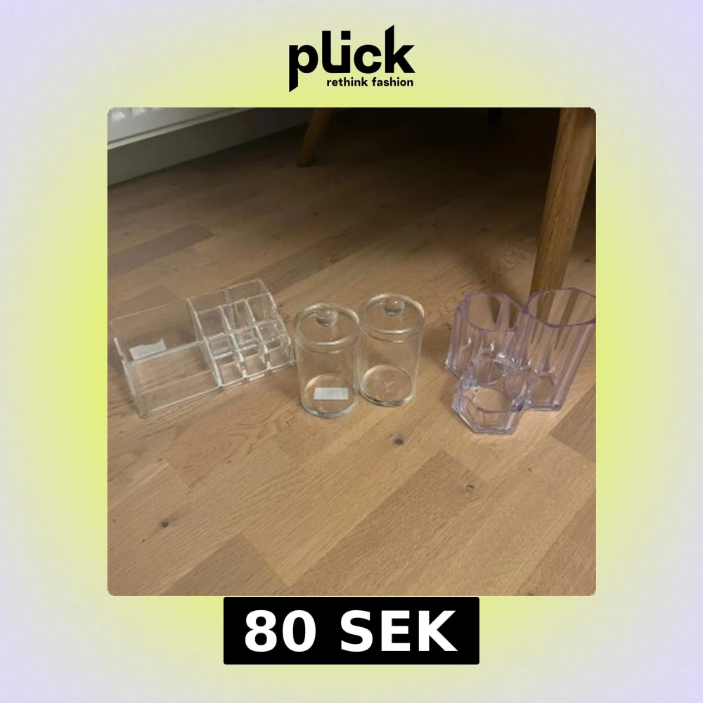 Säljer ett set med tre olika sminkförvaringar i transparent akryl och glas. En rektangulär organiserare med flera fack, två runda glasburkar med lock och en lila akrylbehållare med tre fack i olika höjder. Perfekt för sminkborstar, läppstift och småprylar. Kan köpa de separat och då bara kontakta mig så diskuterar vi priset