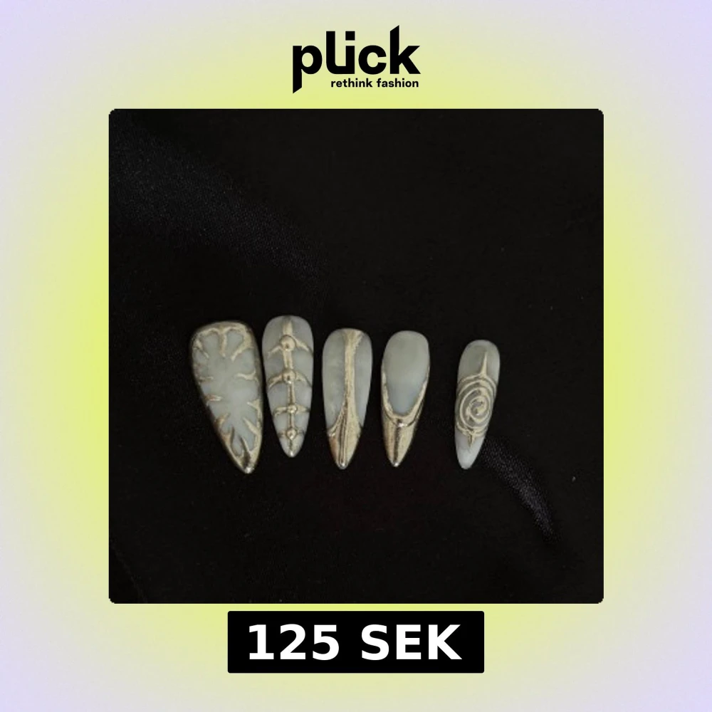 Säljer ett set med 10 press-on naglar i en mjukt ljusgrå färg med unika silvriga 3D-detaljer. Handgjorda av mig, kan även göra custom storlekar o designs!