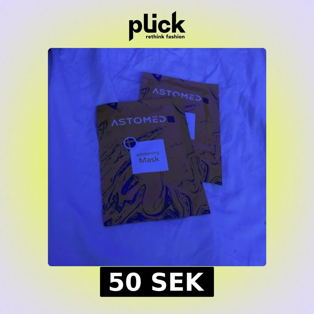 50 för båda. Astomed Whitening Mask är en ansiktsmask i smidigt engångsförpackning. Masken är framtagen för att ljusa upp hudtonen och ge glow. Förpackningen är gul med blå marmorering och vit etikett. Innehåller ingredienser som hyaluronsyra och växtextrakt.