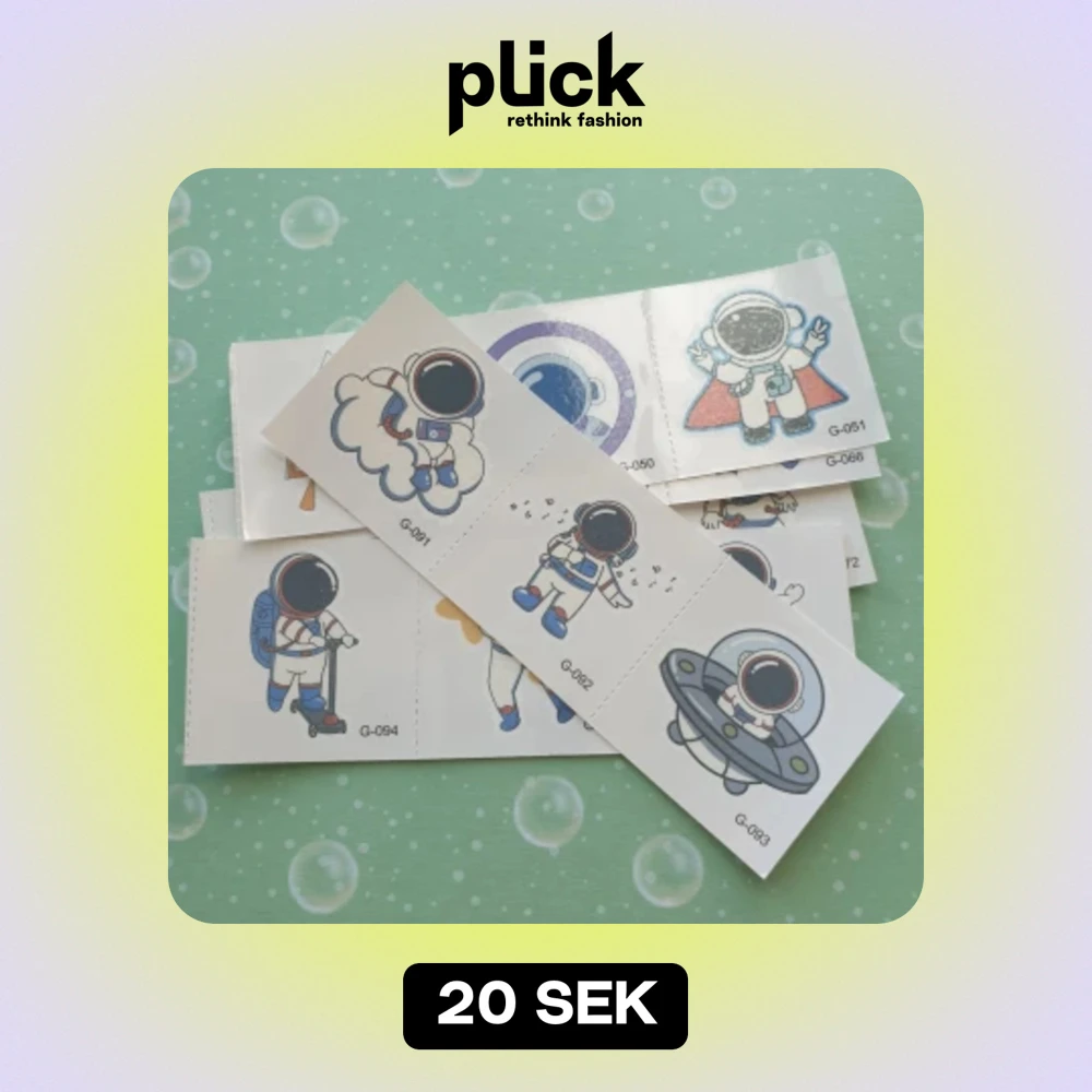 Tatuering/tattoo, Motiv: astronauter, rymd Antal: 5st ark Storlek: ca 4×12cm, Skick: nya/oanvända, Tillfälliga tatueringar du sätter på kroppen med hjälp av vatten
