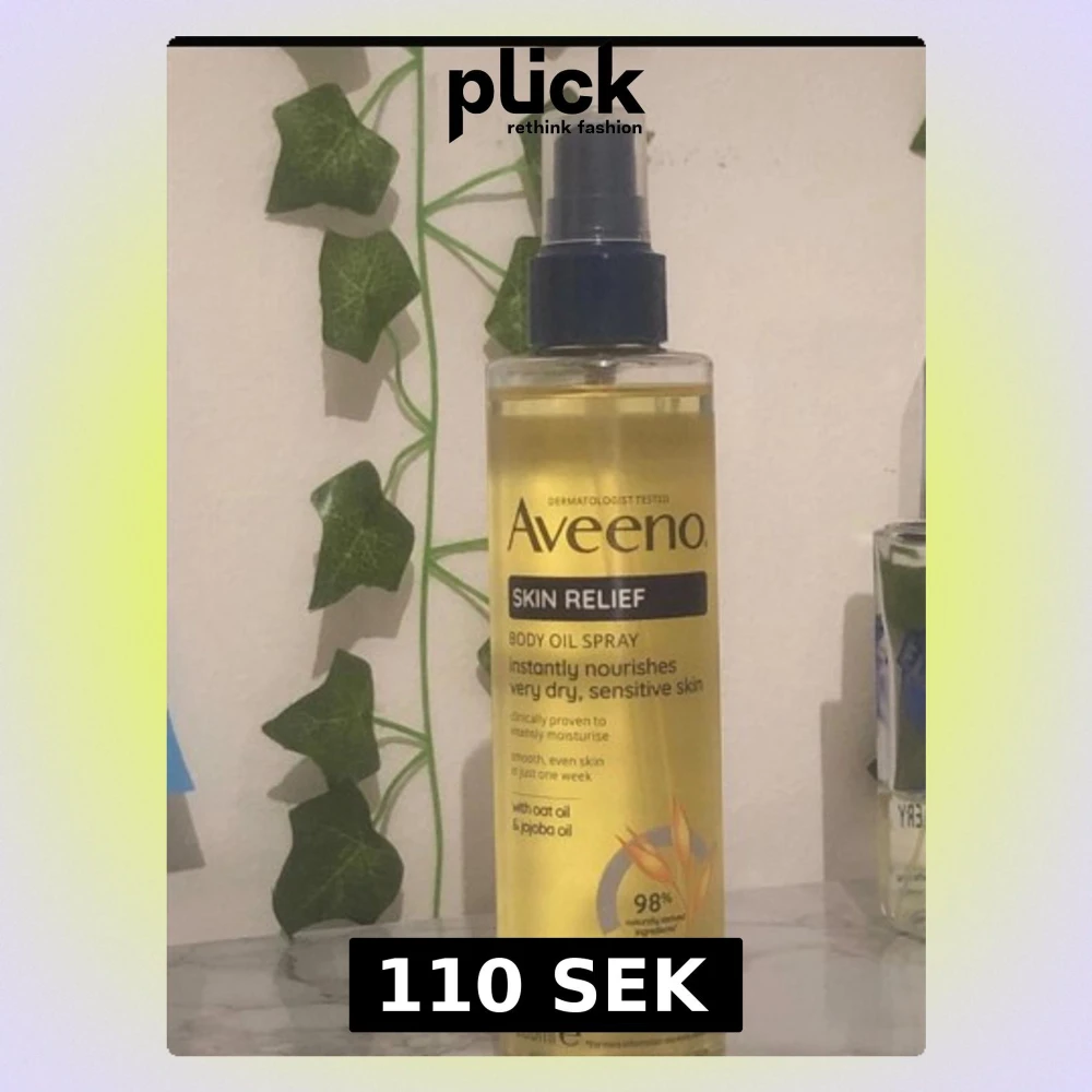 Aveeno Skin Relief Body Oil Spray med havreolja och jojobaolja, perfekt för torr och känslig hud. Sprayflaska i transparent plast med blått lock, innehåller 200 ml. Oljan är ljusgul och absorberas snabbt för mjuk och återfuktad hud.