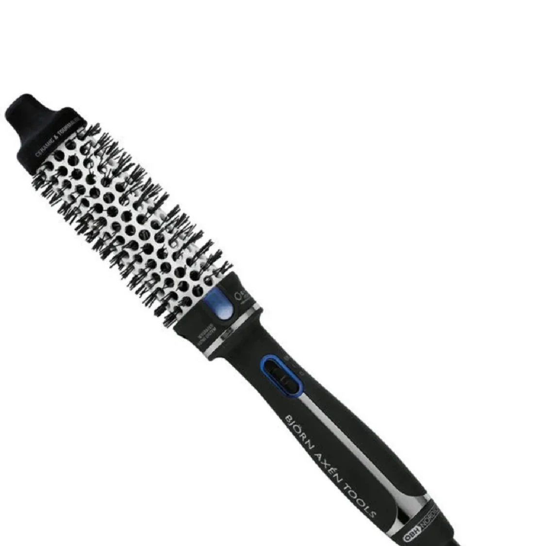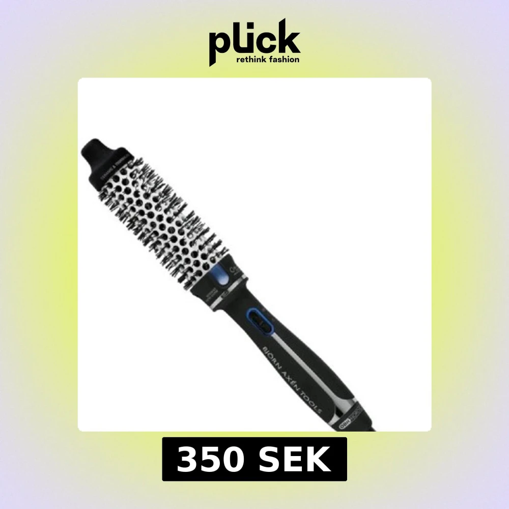 Rundborste från Björn Axén Tools med svart och silver design, keramisk yta och borst i plast. Perfekt för att styla och forma håret med volym.