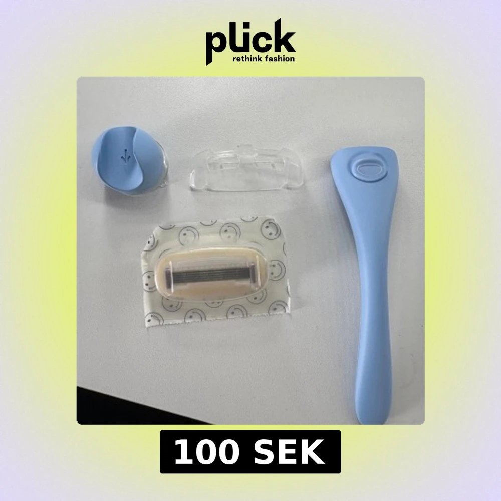 Säljer en ljusblå rakhyvell från estrid. Medföljer ett extra rakblad, ett väggfäste och ett skydd för bladet.