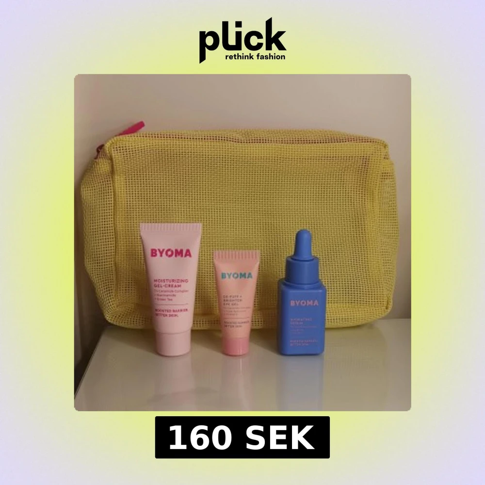 Säljer ett BYOMA hudvårdskit med tre produkter: en rosa Moisturizing Gel-Cream, en ljusrosa De-Puff + Brighten Eye Gel och ett blått Hydrating Serum. Allt kommer i en gul mesh-necessär med rosa dragkedja. Perfekt för dig som vill boosta din hudbarriär. Ögonkrämen och den rosa krämen är helt nya, och serumet är lite använt men vet inte riktigt hur mycket det är kvar. Tror det är ca hälften kvar av det.
