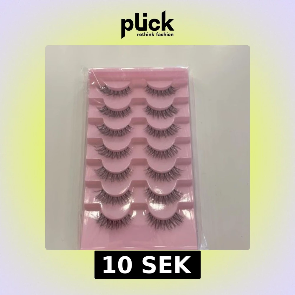 Säljer ett set med sju par svarta lösögonfransar på en rosa bricka. Fransarna är långa, fluffiga och har en naturlig böj för en snygg look. Perfekta för att ge extra volym och längd till dina egna fransar.