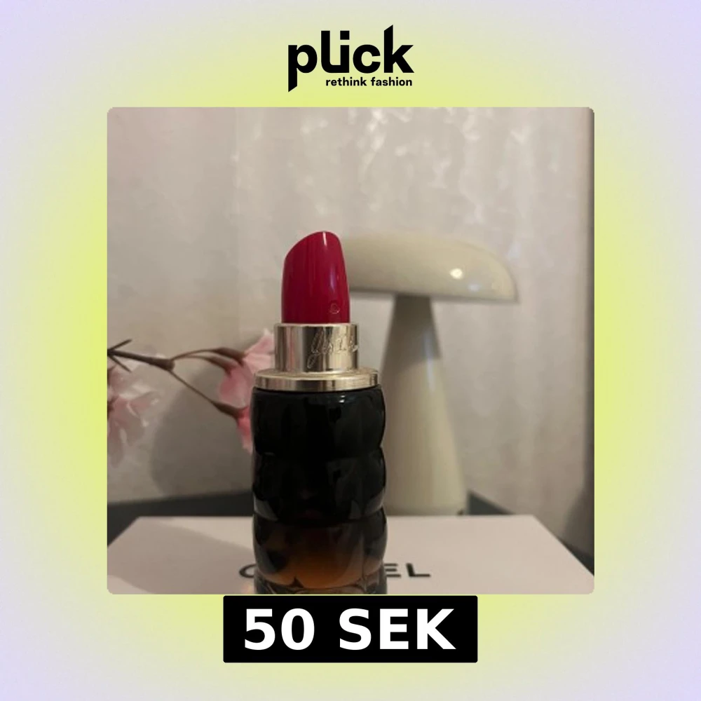 Cool parfymflaska från Cacharel designad som ett läppstift med svart och brun glasbotten och silverdetaljer. Toppen är formad som ett rött läppstift, vilket gör flaskan till en snygg inredningsdetalj på sminkbordet.