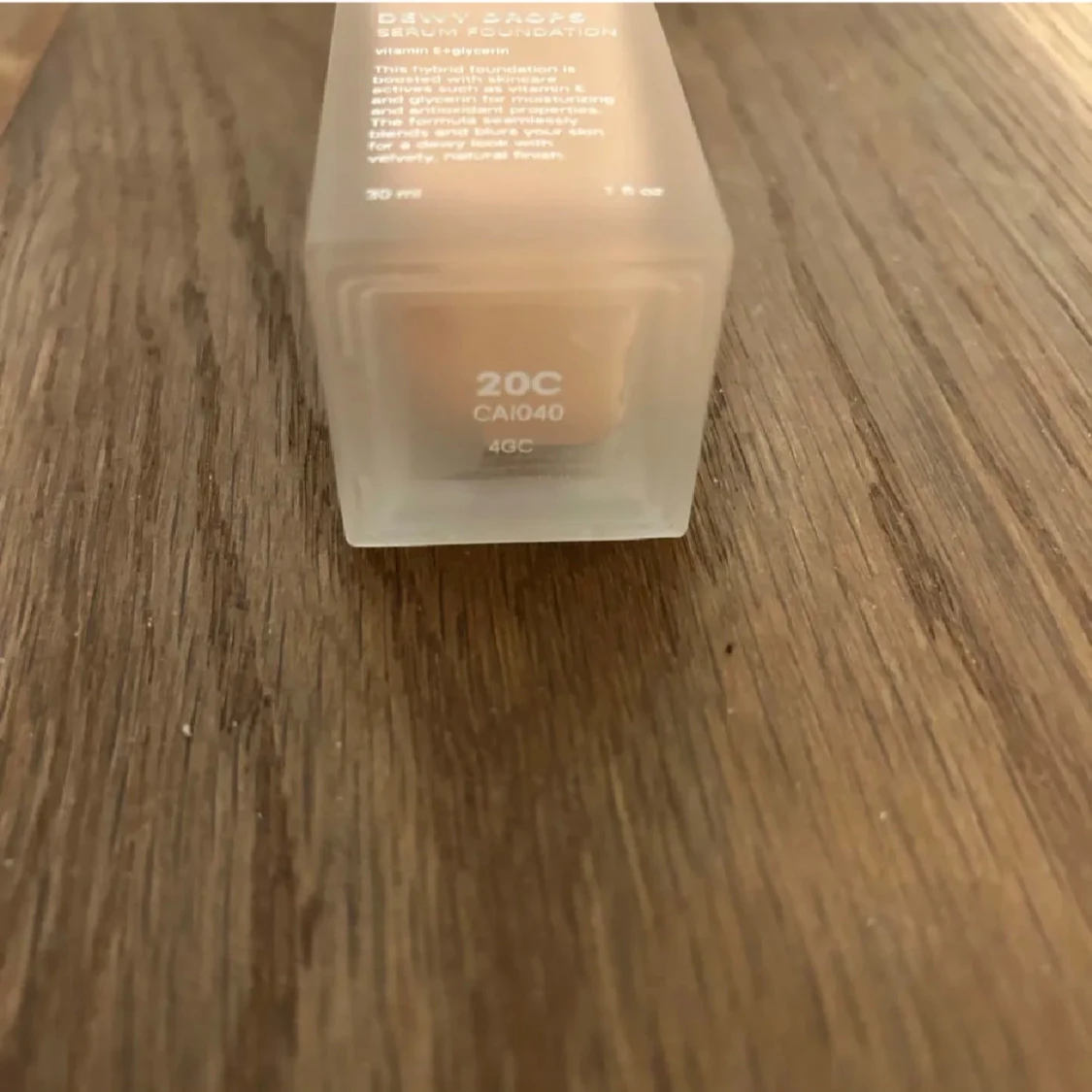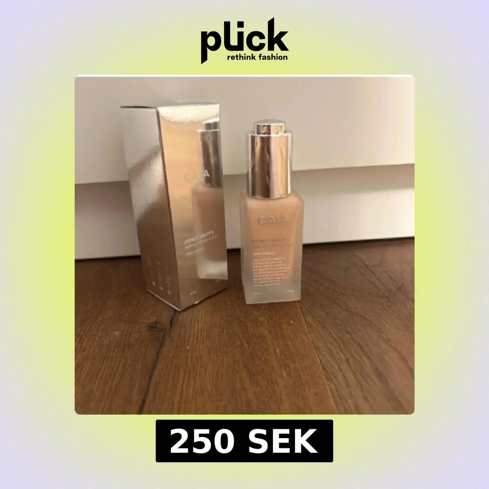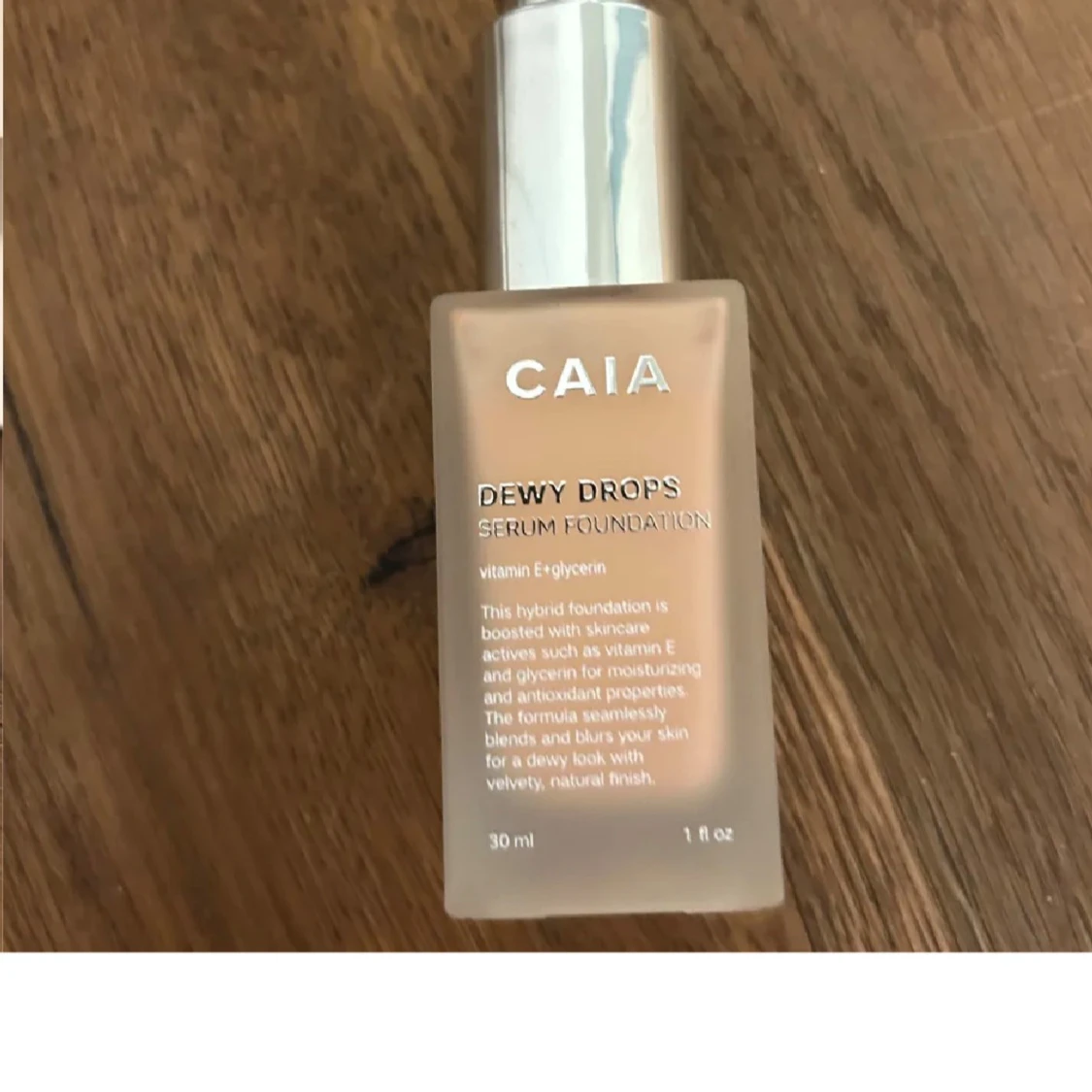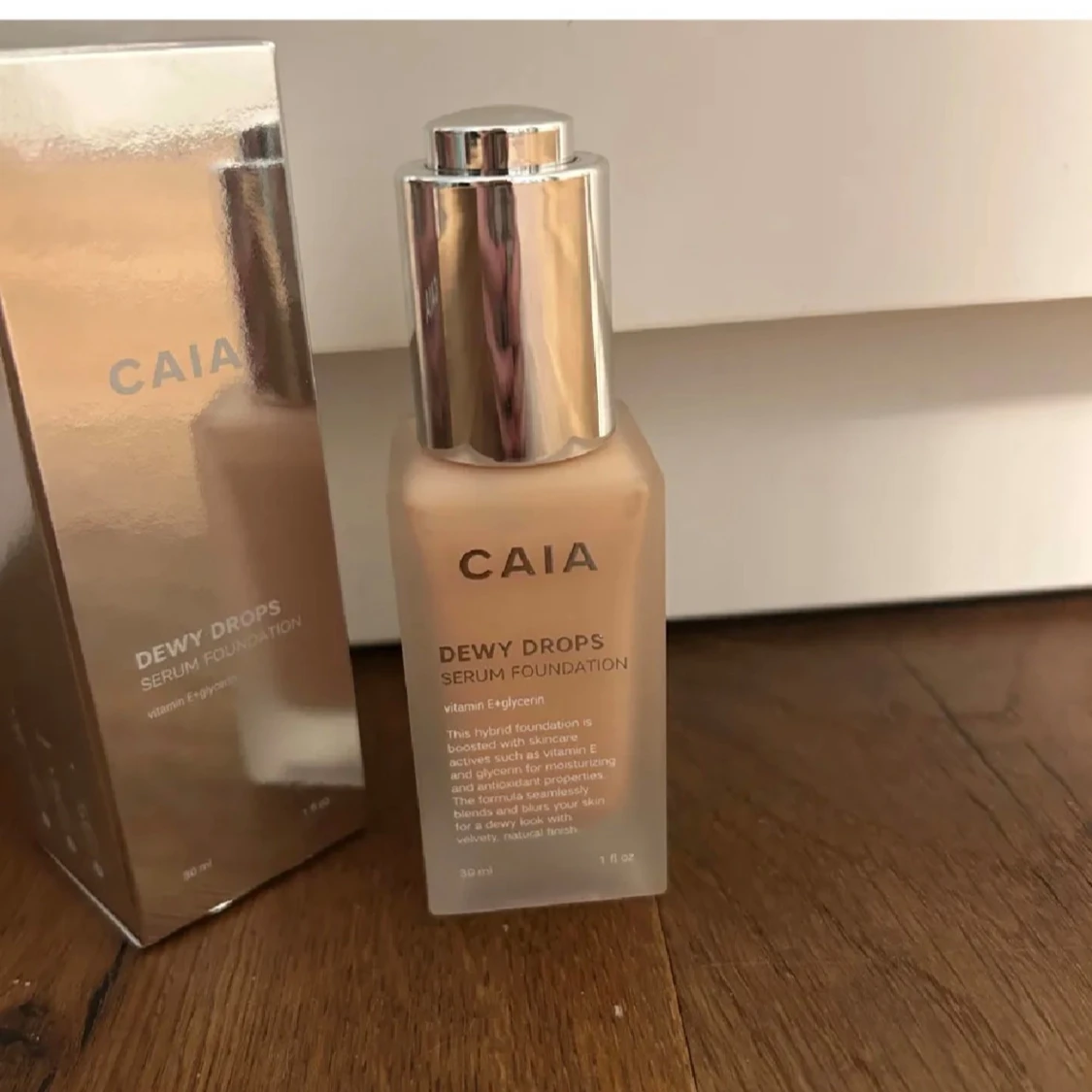 CAIA Dewy Drops Serum Foundation i nyansen 20C. Kommer i en frostad glasflaska med silvrig pump och lock. Innehåller 30 ml och är berikad med vitamin E och glycerin för återfuktning och lyster. Ger en naturlig, dewy finish och smälter in snyggt i huden. Helt oanvänd