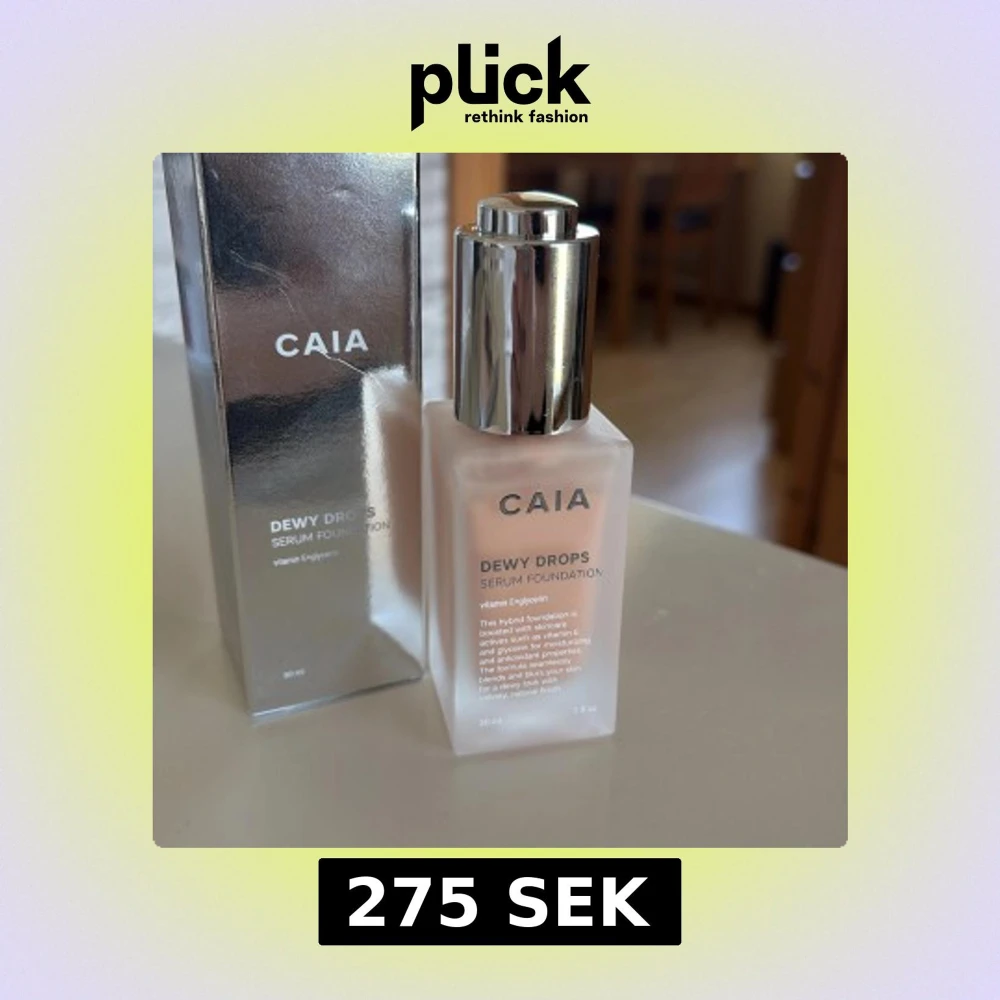 CAIA Dewy Drops Serum Foundation i nyansen 20C, kommer i en lyxig glasflaska med silvrig pump och matchande förpackning. Öppnad men aldrig använd då det var fel färg😍🤩