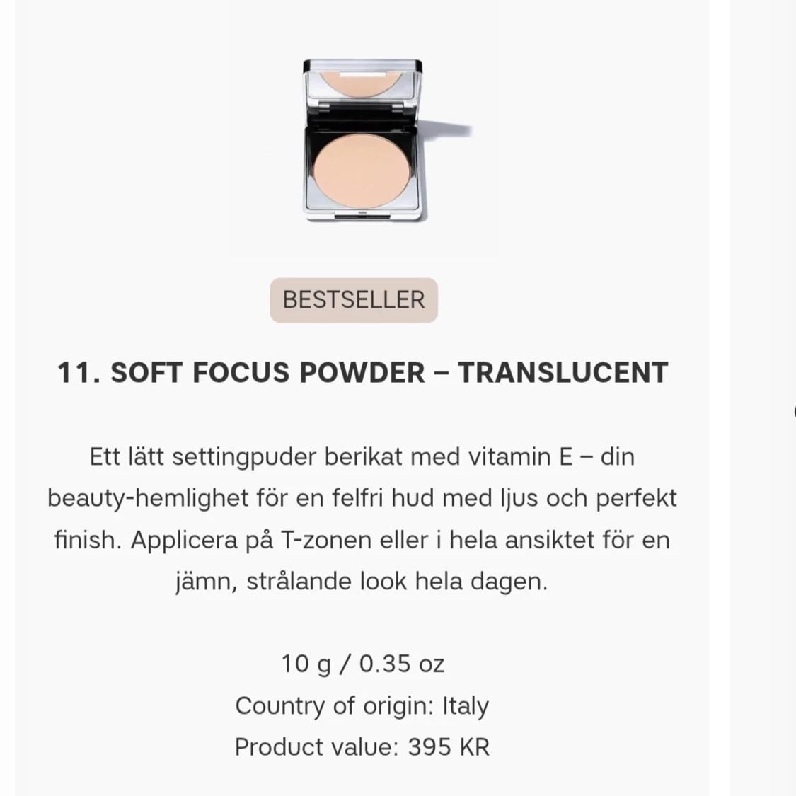 Soft Focus Setting Powder (Translucent) Silkeslent puder som fixerar makeup och suddar ut porer. Ord. pris: 395 kr