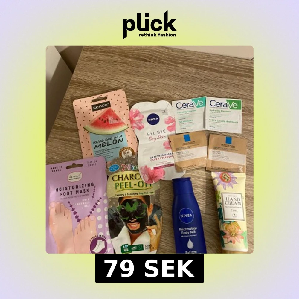 Ett urval av hudvårdsprodukter inklusive en ansiktsmask från Nivea, en handkräm, en fuktgivande kroppskräm från Nivea, och en kolbaserad peel-off mask. Inkluderar även CeraVe rengöringsprodukter och en fuktgivande fotmask med lavendel. Inget är såklart använt! Man får allt på bilden för priset på annonsen😍 Man kan dock även köpa t.ex. 1 eller 2 saker så man behöver inte köpa allt!💗