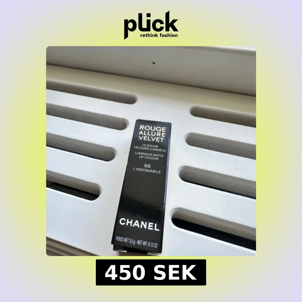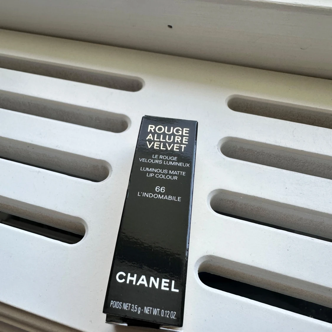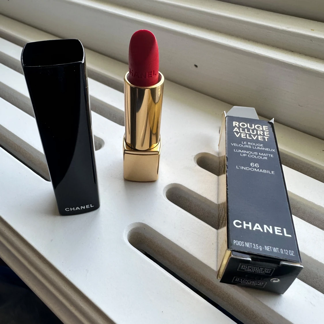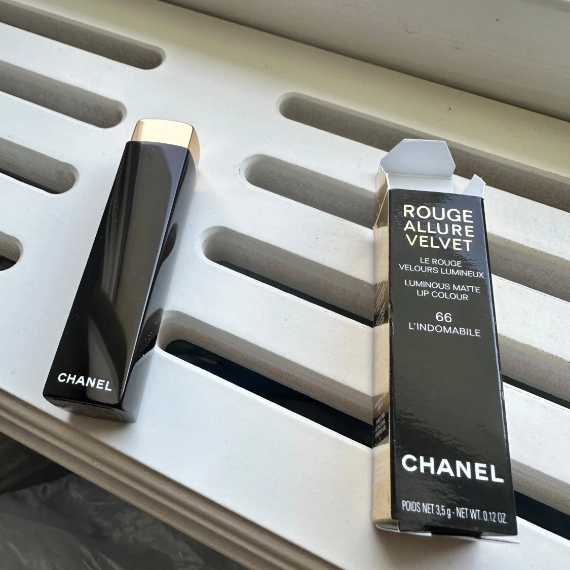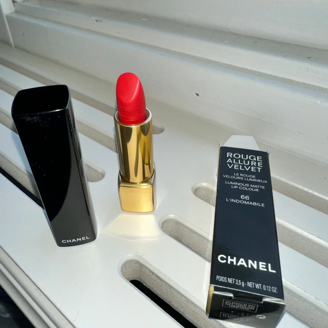 Chanel Rouge Allure Velvet i nyansen 66 L'Indomabile är ett lyxigt matt läppstift i en intensiv röd färg. Hylsan är elegant svart och guld med klassisk Chanel-logga. Läppstiftet har sammetslen finish och ger en djup, hållbar färg med lyxig känsla.