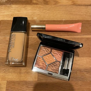 Paket med smink! Ögonskuggspalett från Dior (oanvänd), foundation från Dior (använd, kanske 60% kvar) och läppglans från Clarins (använd ca 5ggr).