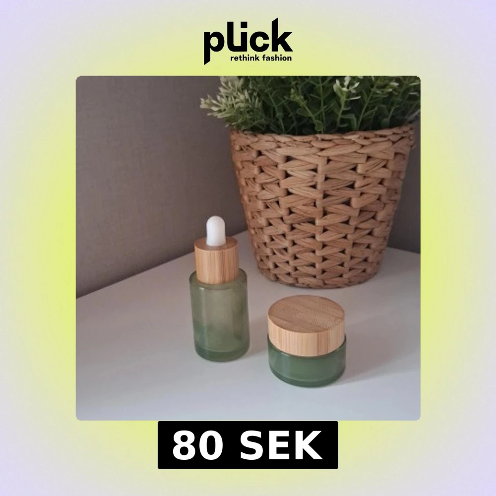Två glass behållare med bambu lock en för serum och en för kräm t.e.x. Köpta från systrarna grene använt en gång så nästan som nya.