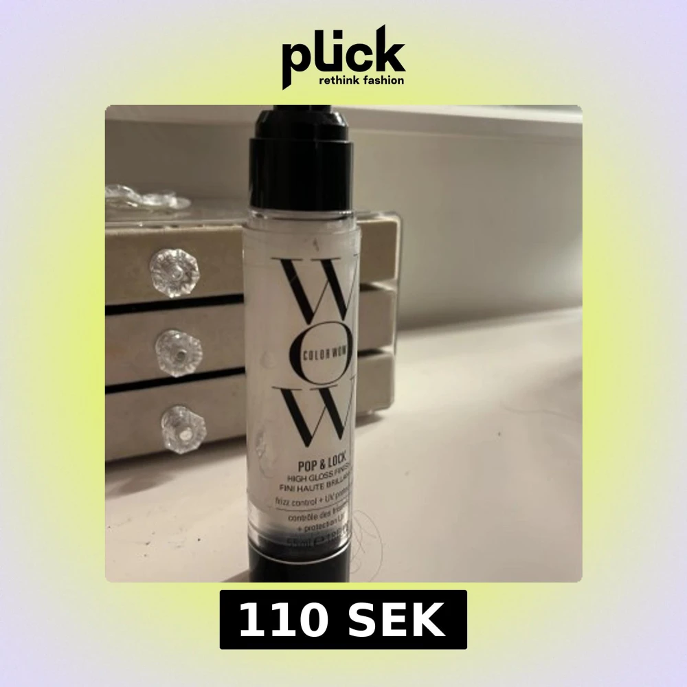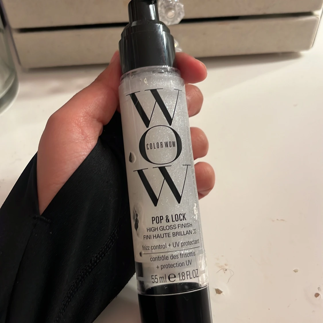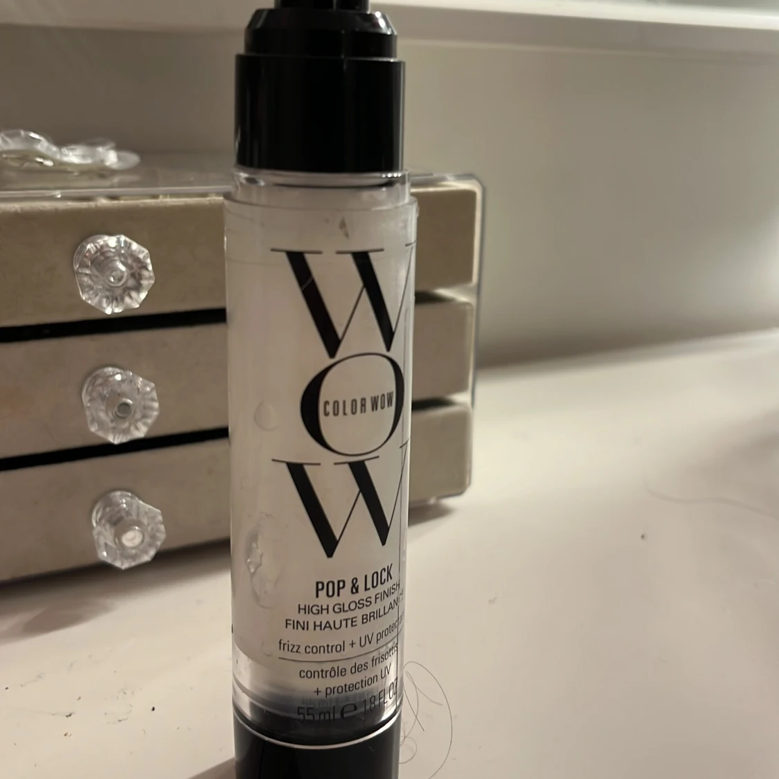 Color Wow Pop & Lock High Gloss Finish är en transparent glansprodukt i pumpflaska på 55 ml. Den ger hög glans, UV-skydd och hjälper till att kontrollera friss. Flaskan är genomskinlig med svart pump och lock, och har en modern design med tydlig logga.
