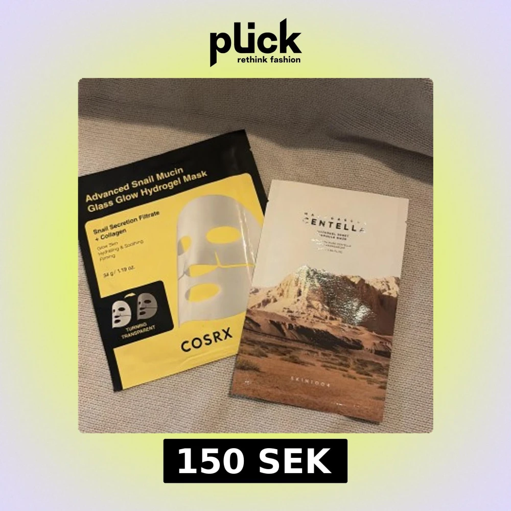 Två ansiktsmasker: COSRX Advanced Snail Mucin Glass Glow Hydrogel Mask med snigelsekret och kollagen för glow och återfuktning, samt SKIN1004 Madagascar Centella Watergel Sheet Mask med centella från Madagaskar. Perfekta för en återfuktande boost.