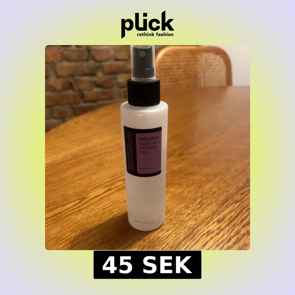 En genomskinlig plastflaska med svart spraymunstycke, innehållande COSRX AHA/BHA Clarifying Treatment Toner. Tonern är 150 ml och har en lila etikett framtill. Perfekt för dig som vill ha en exfolierande toner med mild formula och sprayfunktion. Står under flaskan att den gick ut i början av 2025 men tror ej de ska ha jättestor betydelse
