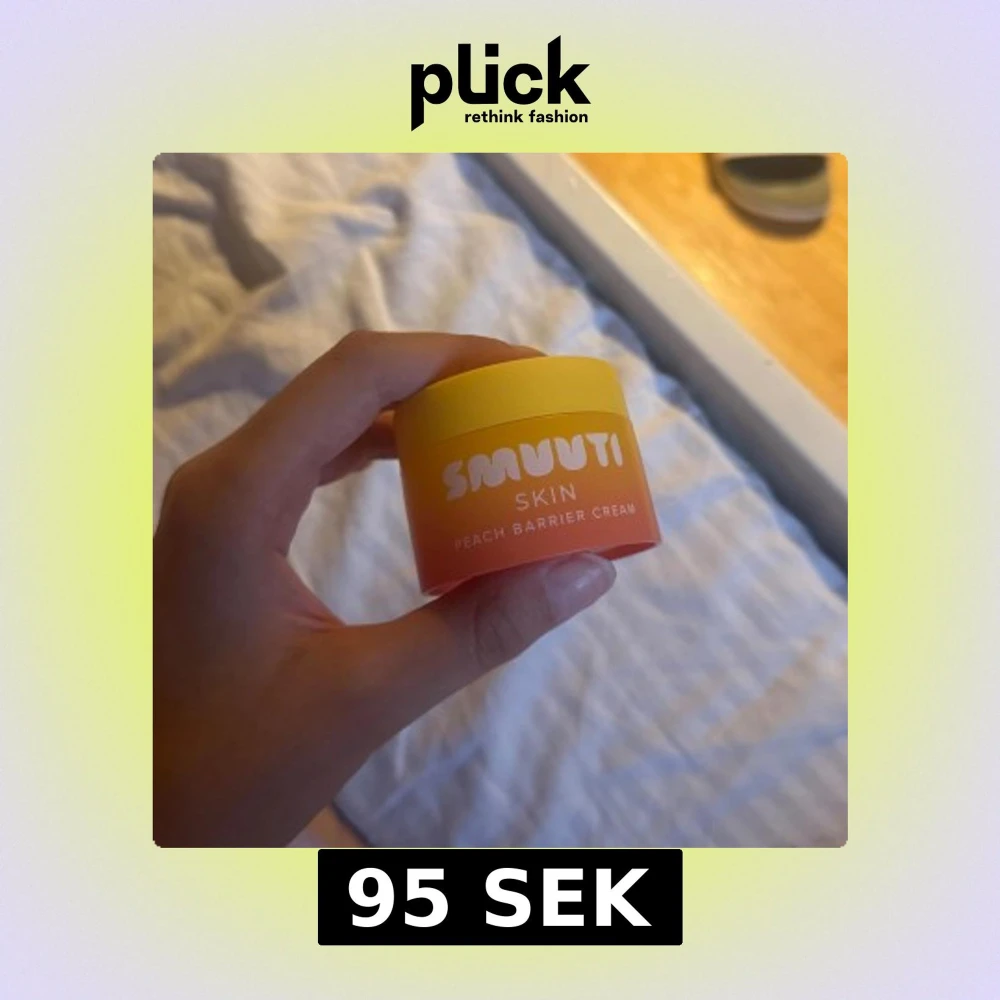 Peach Barrier Cream från Smuutiskin i en snygg burk med gul och persikofärgad design. Vegansk ansiktskräm på 51 ml, tillverkad i Korea. Perfekt som sista steget i din hudvårdsrutin efter toner och serum.
