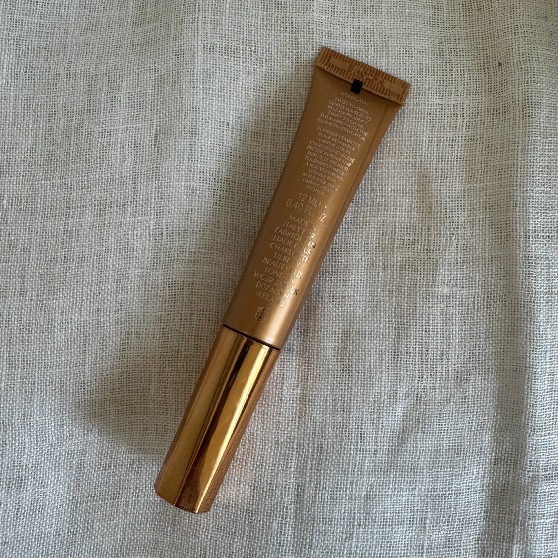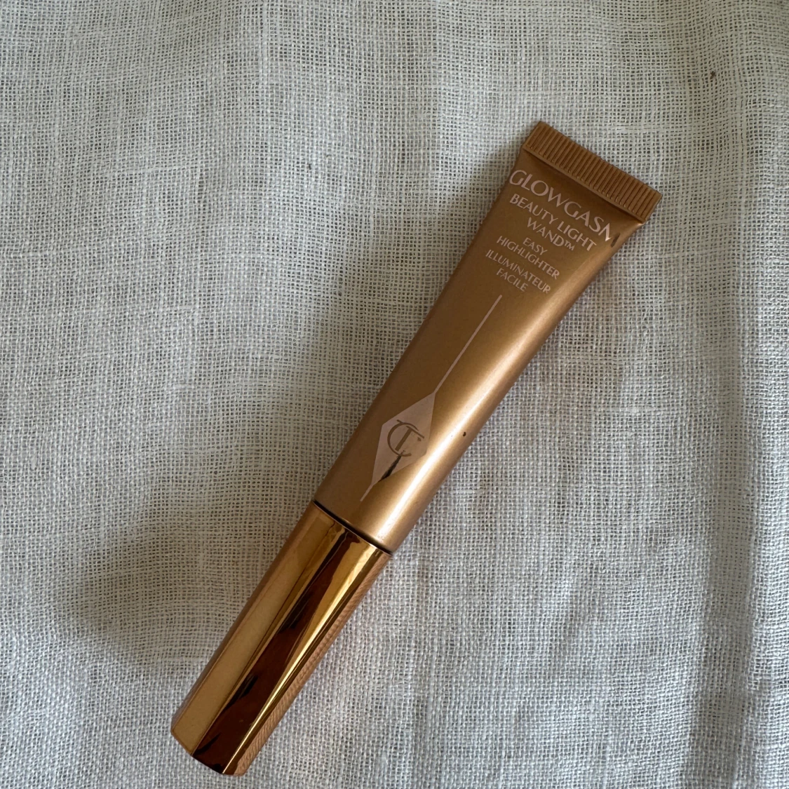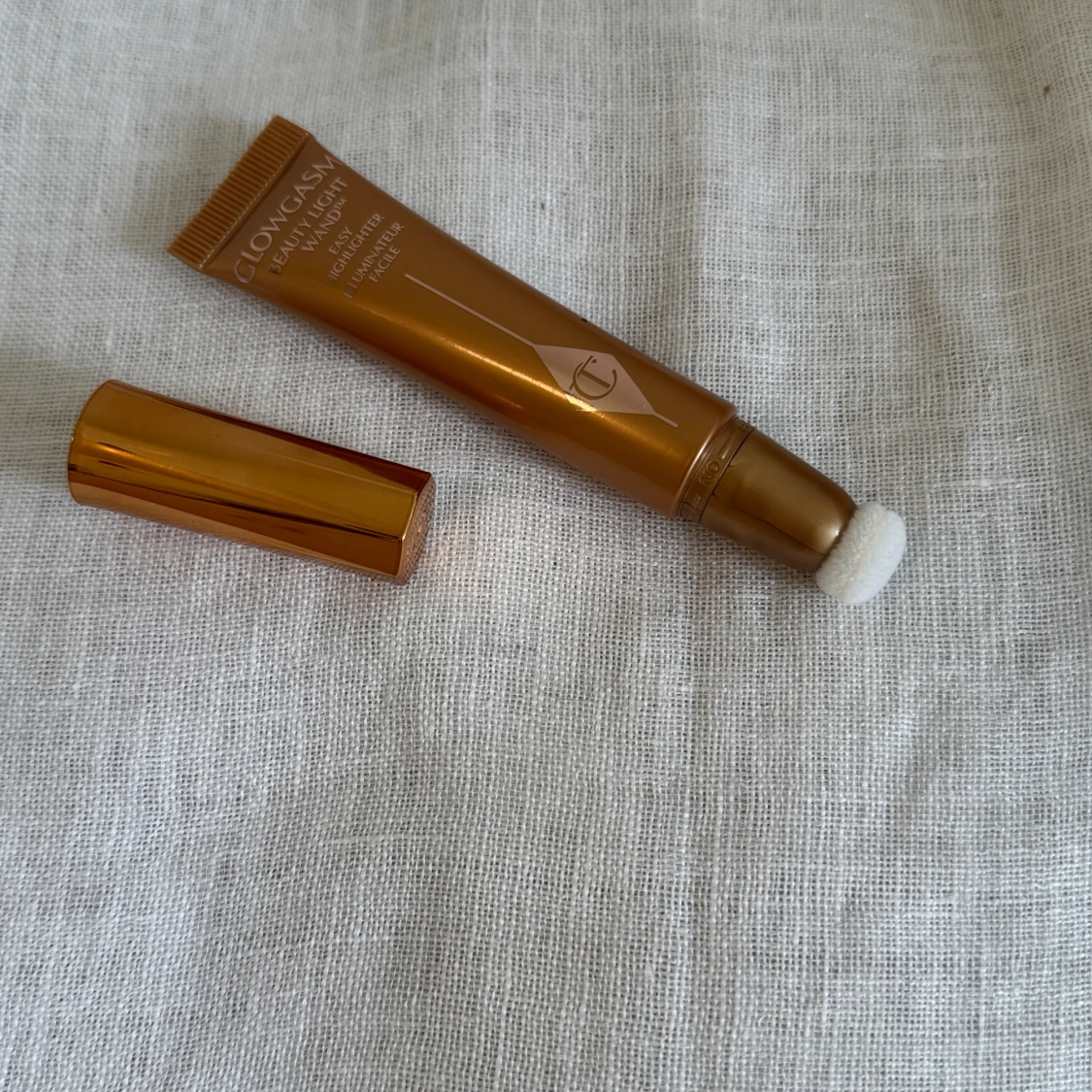 Glowgasm Beauty Light Wand från Charlotte Tilbury i en lyxig guldbrun tub med applikator. Flytande highlighter som ger ett snyggt glow och är enkel att använda tack vare den mjuka svampapplikatorn. Perfekt för att framhäva kindben och ge ansiktet lyster. Aldrig använd