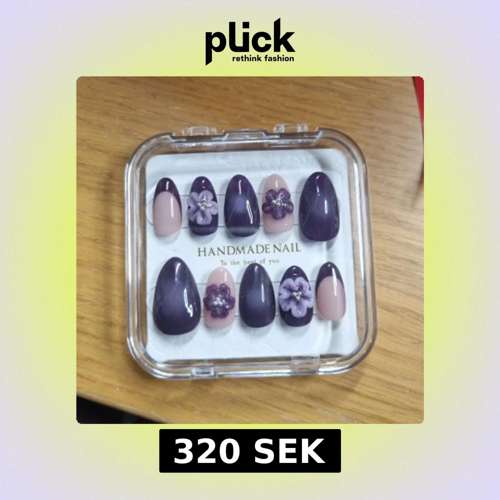 Säljer ett set med handgjorda lösnaglar i lila och nude nyanser. Några naglar är dekorerade med 3D-blommor i lila och pärldetaljer. Naglarna har en oval form och kommer i en genomskinlig ask.