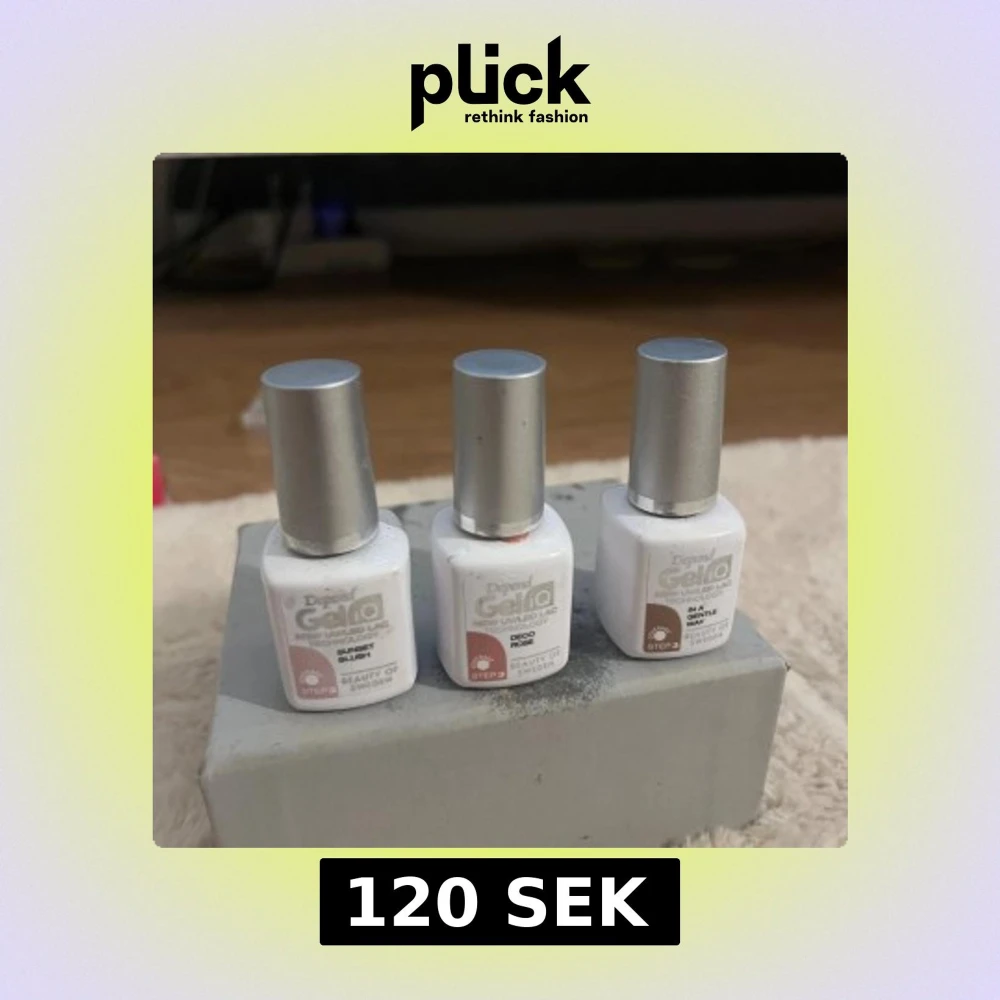 Tre Depend Gellack nagellack i färgerna Sunset Blush (ljusrosa), Deco Rose (mellanrosa) och Gentle Way (mörkbrun). Flaskorna är vita med silverfärgade lock och har en smidig pensel för enkel applicering. Perfekt för dig som gillar geléfinish och snygga naglar. Dom är använda och därför ca 50% använda!