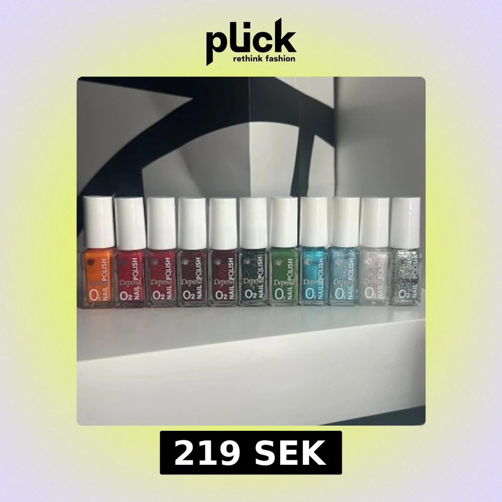 Säljer ett set med 10 Depend O2 nagellack i olika färger: orange, röd, vinröd, mörklila, svart med glitter, grön, blå, ljusblå, silver och glitter. Små flaskor med 5 ml i varje