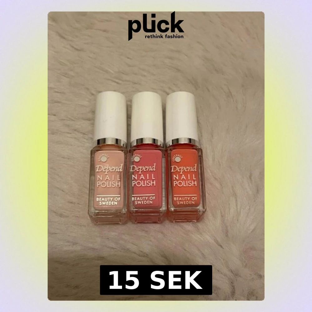 Säljer tre snygga nagellack från Depend i färgerna ljus aprikos, korallrosa och orange. Flaskorna är fyrkantiga med vita lock och silvriga detaljer. Perfekt för dig som vill ha fräscha och trendiga naglar. Alla lack har en klassisk pensel för enkel applicering.