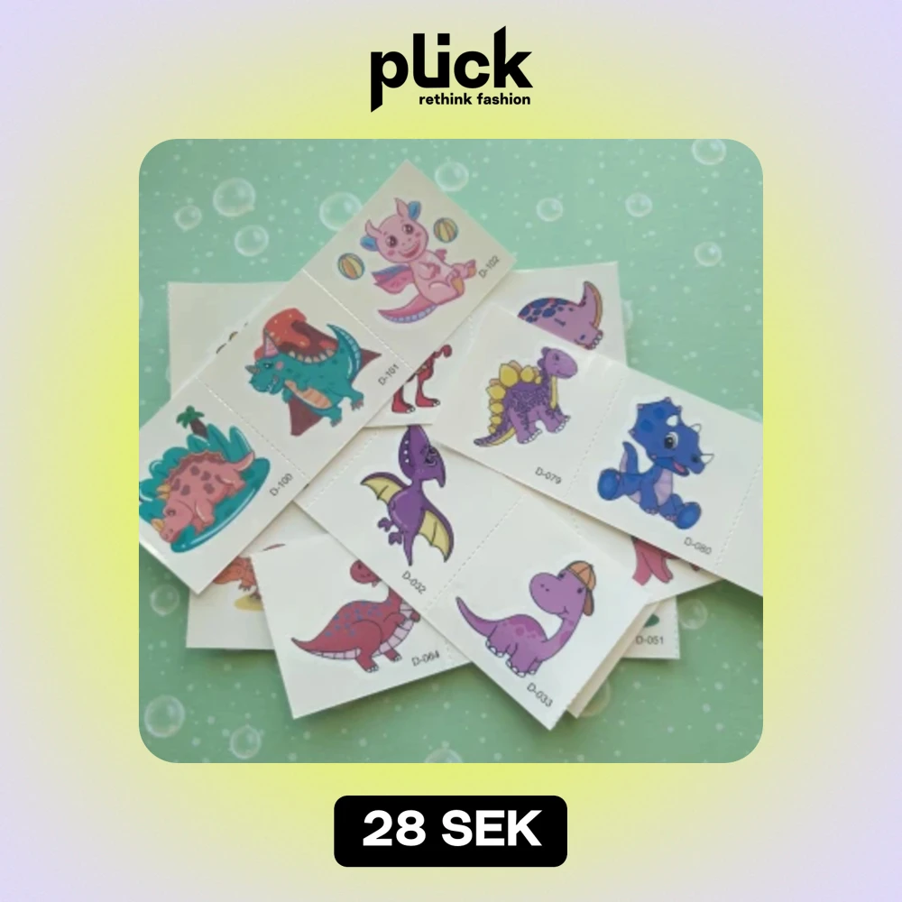 Tatuering/tattoo Motiv: dinosaurier Antal: 7st ark Storlek: ca 4×12cm Skick: nya/oanvända Tillfälliga tatueringar du sätter på kroppen med hjälp av vatten