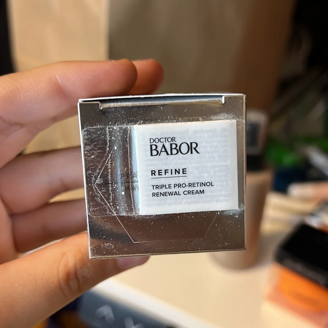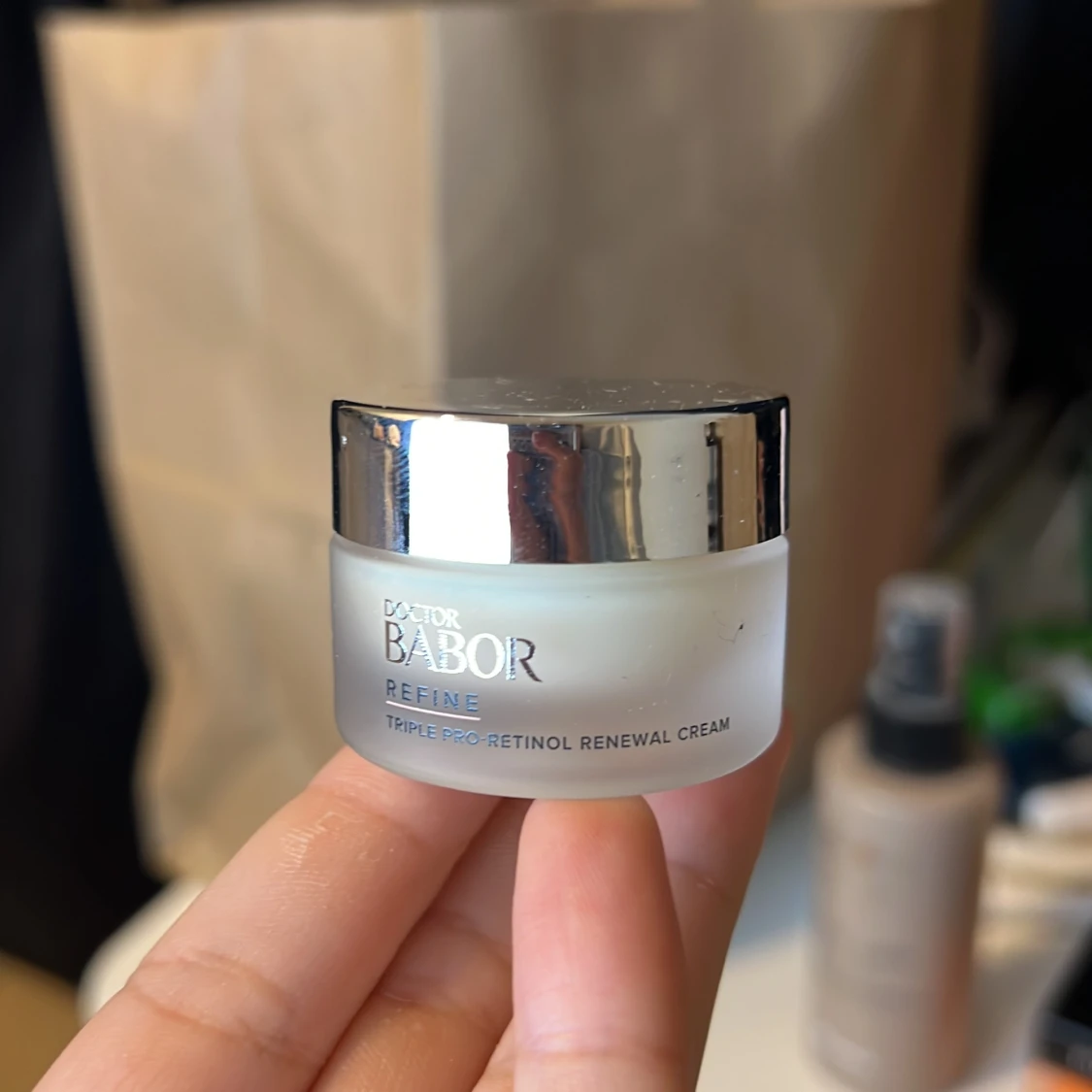 Lyxig ansiktskräm från Doctor Babor, Refine Triple Pro-Retinol Renewal Cream i en frostad glasburk med silvrigt lock. Innehåller 15 ml och är framtagen för att ge jämnare och fräschare hudton med tre olika retinoltyper. Passar alla hudtyper. Nypris ca 500kr. Helt oanvänd