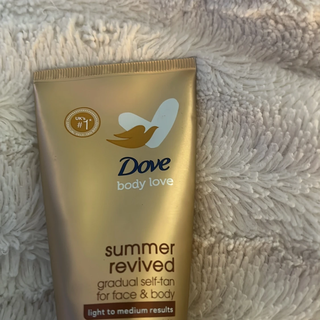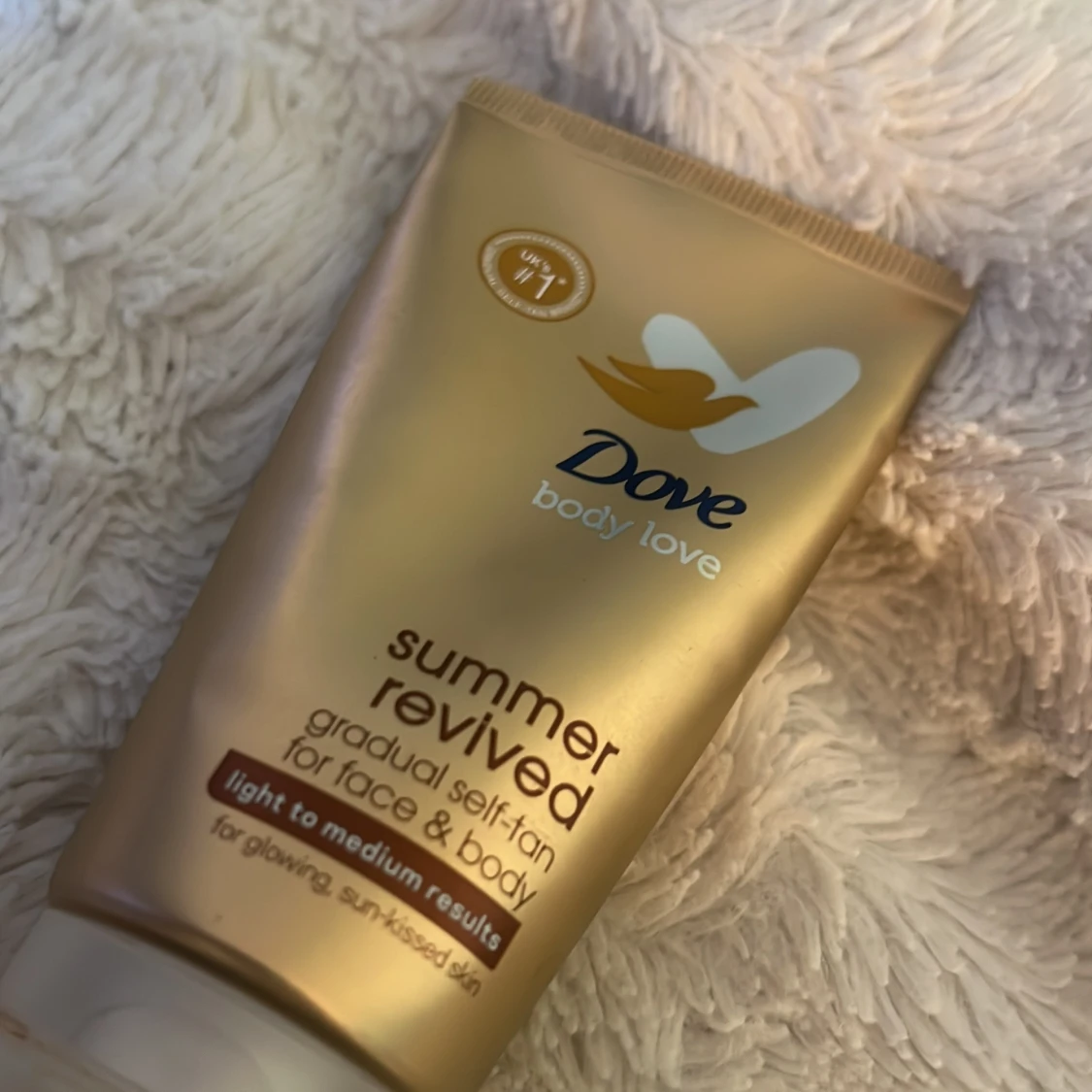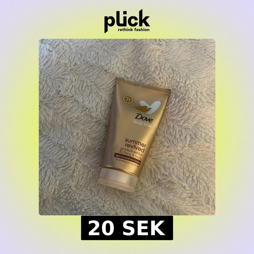 Dove Summer Revived gradual self-tan för ansikte och kropp, ger en lätt till medium solkysst ton. Kommer i en snygg guld tub med vitt och brunt tryck. Perfekt för dig som vill ha en naturlig glow och jämn färg utan ränder. Använt endast ett få tal gånger💗
