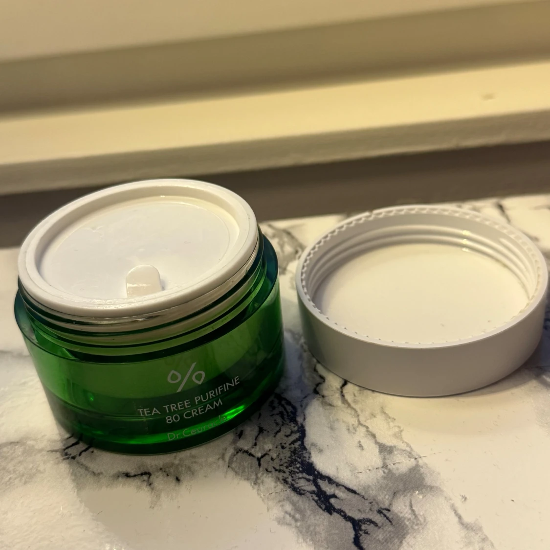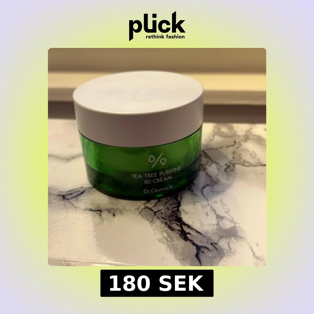 En grön burk med vit lock innehållande Tea Tree Purifine 80 Cream från Dr.Ceuracle. Krämen är framtagen med tea tree-extrakt och passar perfekt för dig som vill ha en fräsch och återfuktande hudvårdsrutin. Snygg och stilren design i plast.