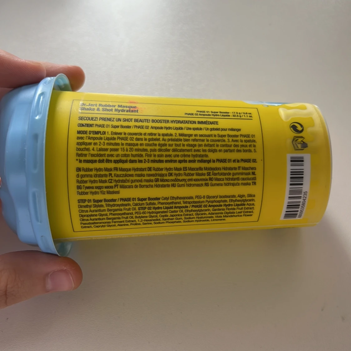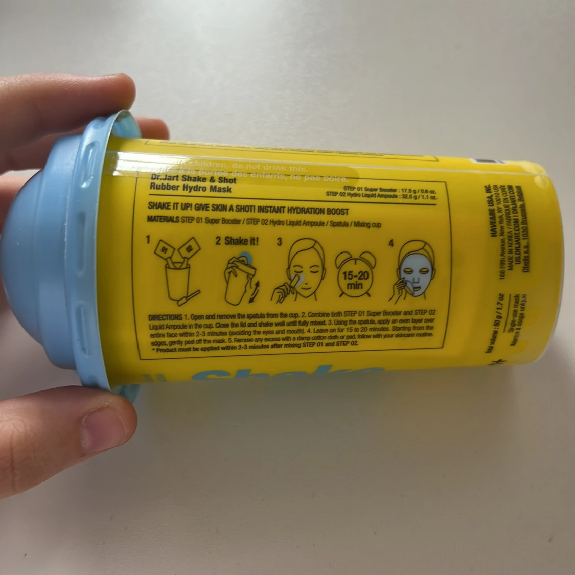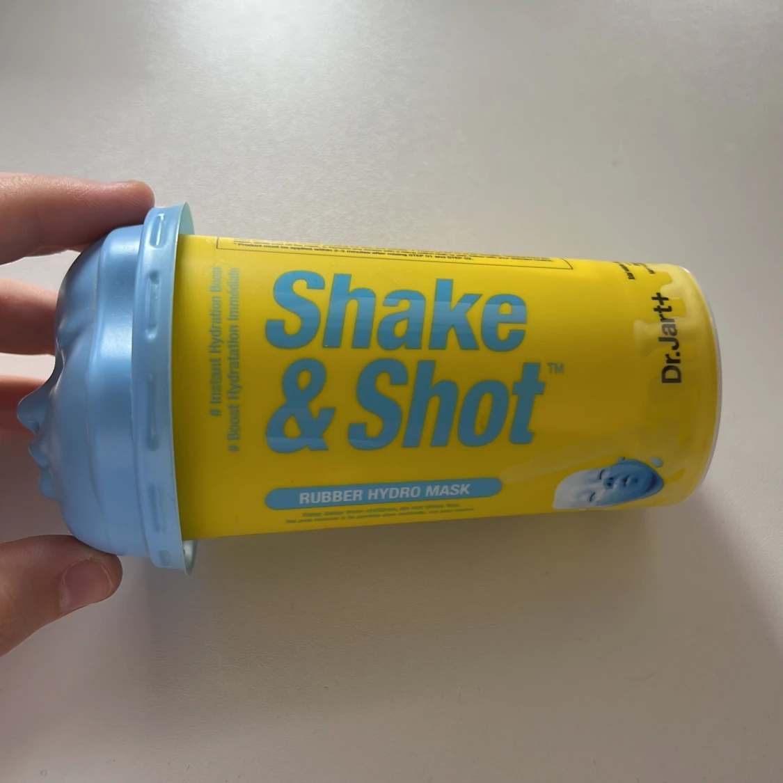 Dr.Jart+ Shake & Shot Rubber Hydro Mask i en cool gul och blå förpackning med ansiktsformad lock. Masken blandas själv i bägaren och ger huden en riktig fuktboost. Perfekt för dig som vill testa en innovativ ansiktsmask med rolig applikation. Nypris 149kr. Helt oanvänd