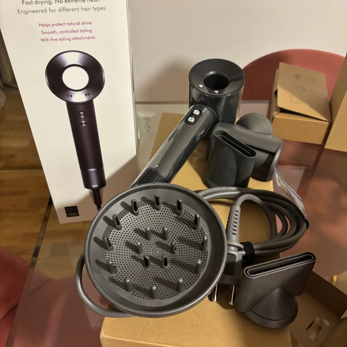 Tja! Säljer denna Dyson Supersonic™ HD07 i färgen Black/Nickel (svart med metallgråa detaljer). Det är en nyare version av Supersonic med fem magnetiska stylingmunstycken och uppdaterad värmesensor för jämnare temperaturkontroll. Den är varsamt använd och fungerar felfritt. Pris och bilder går att diskutera så fråga gärna! 🙂