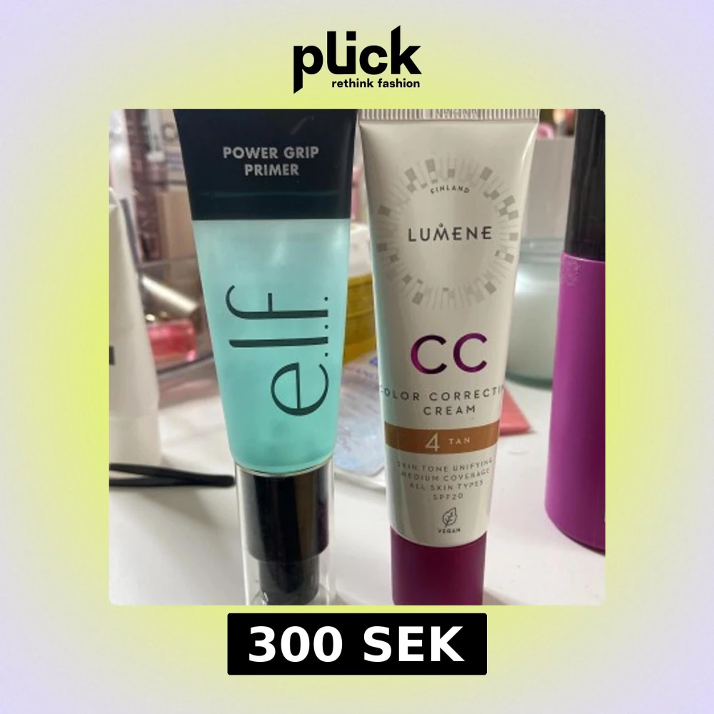 Säljer en e.l.f. Power Grip Primer i genomskinlig gel-formula och en Lumene CC Color Correcting Cream i nyansen 4 Tan. Primern ger en jämn bas och CC-creamen jämnar ut hudtonen med medium täckning och SPF 20. St, 150 kr, båda 300 aldrig använda🫶🏼