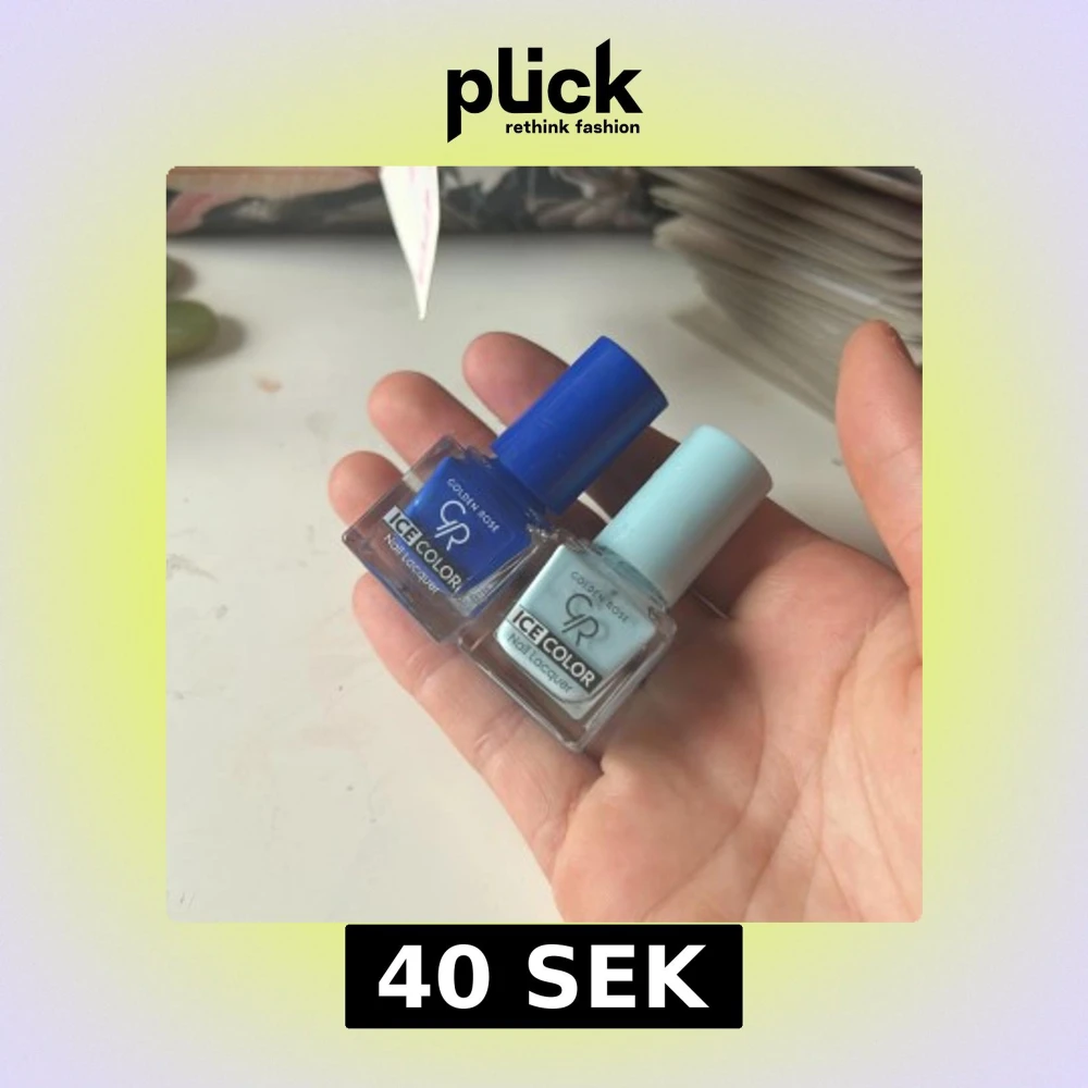 Två snygga nagellack från Golden Rose Ice Color-serien. Ena flaskan är intensivt blå och den andra är ljusblå, båda med fyrkantig glasflaska och färgmatchat lock. Perfekt för att skapa coola nageldesigner eller mixa färger.