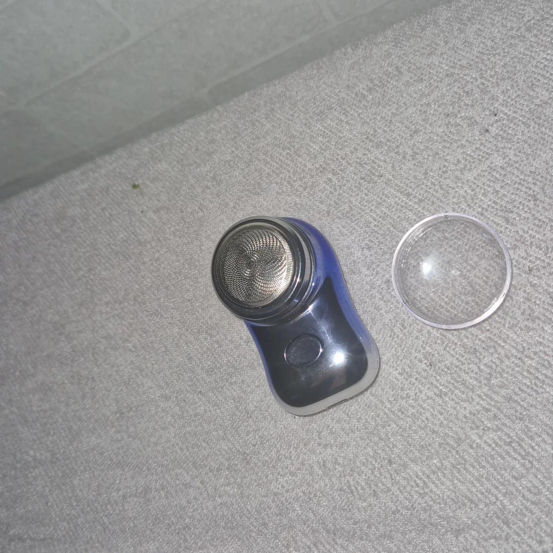 Elektrisk ansiktsrengörare med rund metallisk borste och blått handtag. Kommer med ett genomskinligt plastlock. Perfekt för att applicera toner och rengöra huden på djupet.