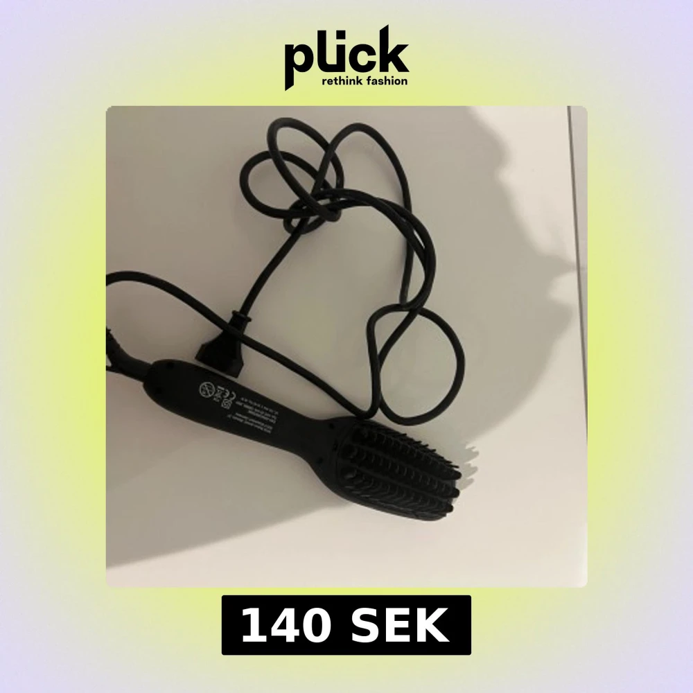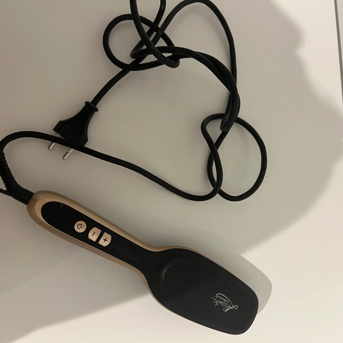 Säljer en elektrisk hårborste med svart borsthuvud och guld/svart handtag. Borsten har knappar för temperaturinställning och en lång sladd med EU-kontakt. Perfekt för att styla och platta håret snabbt och enkelt.