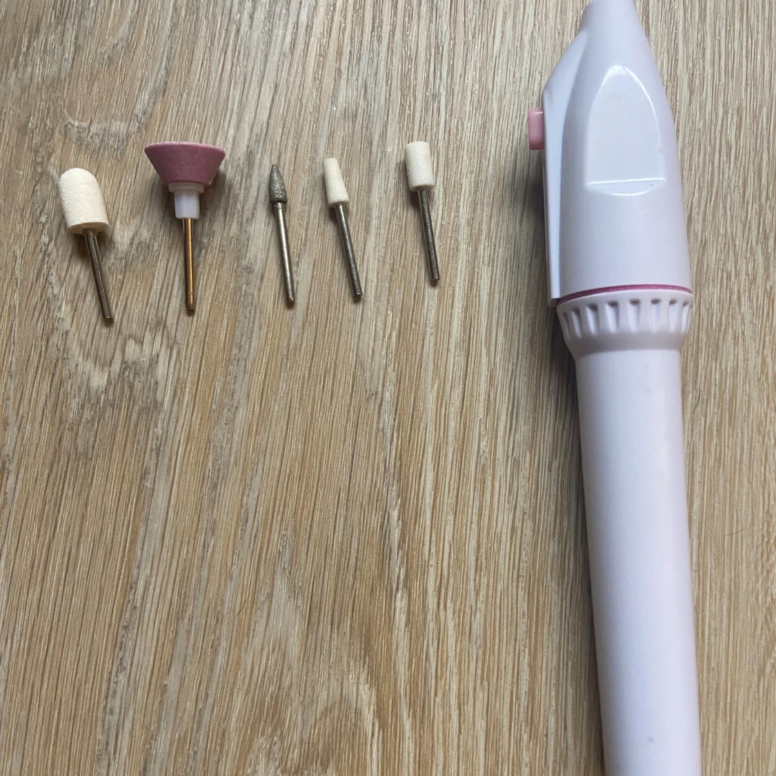 Elektrisk nagelfil med fem utbytbara sliphuvuden. Man behöver 2st AA batterier.