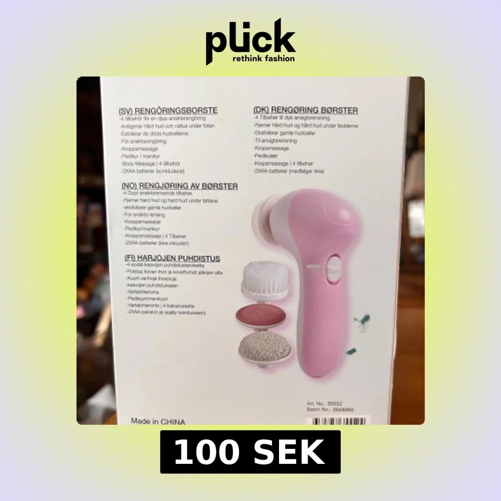 Rosa elektrisk rengörings och massageborste med 4 olika munstycken för t ex ansiktet, pedikyr och massage. Drivs med 2 st AA-batterier som medföljer.