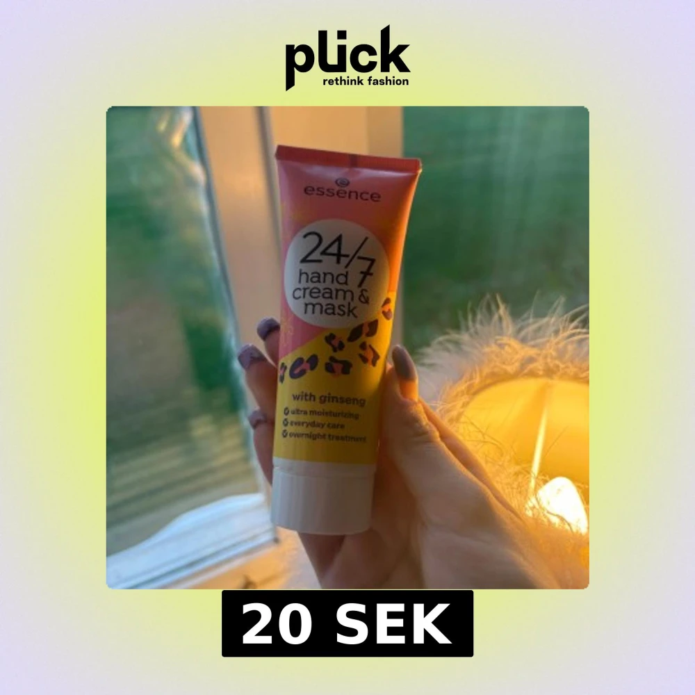 Essence 24/7 handkräm & mask med ginseng i en färgglad tub med leopardmönster. Innehåller 75 ml och ger ultra återfuktning, perfekt för daglig vård eller som nattmask. Tuben är rosa och gul med vit kork och har en mjuk, krämig formula.