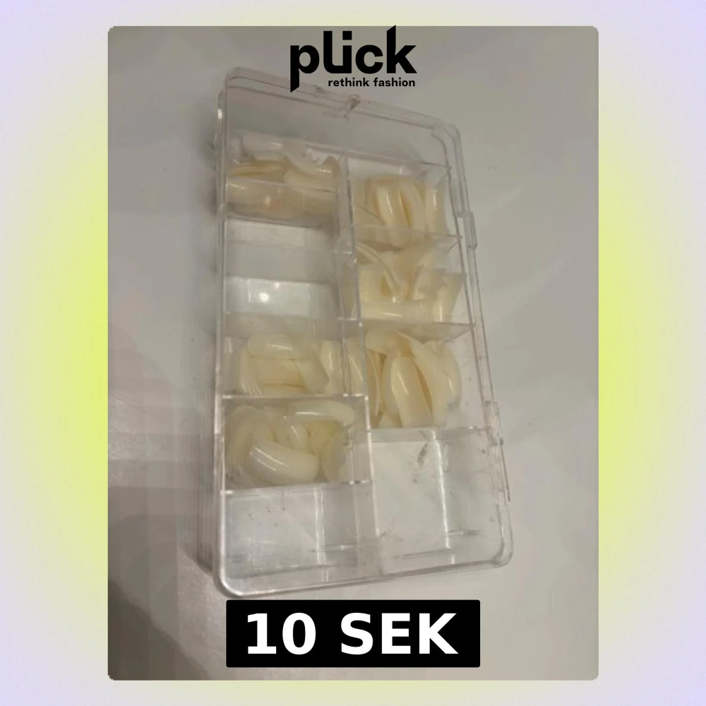 Säljer ett set med falska nageltippar i olika storlekar, förpackade i en genomskinlig plastlåda med fack. Nageltipparna är mjölkvita och har en klassisk, lätt böjd form. Perfekt för att skapa egna gel- eller akrylnaglar hemma.