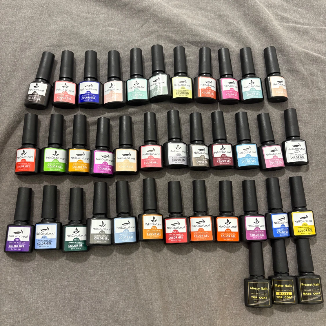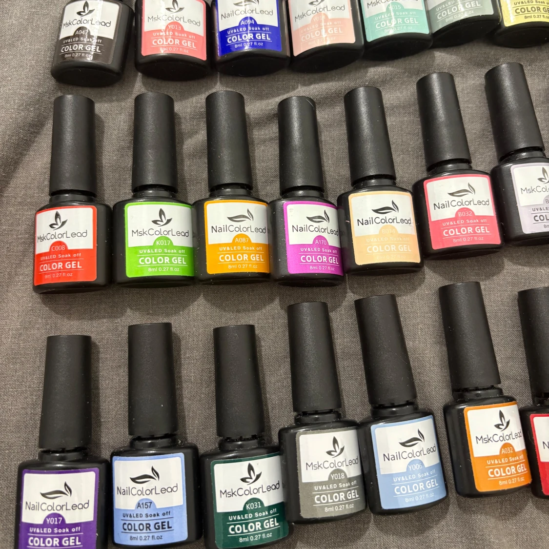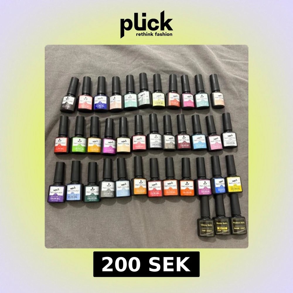 Helt nytt oanvänd och oöppnad gel polish i olika färger som härdas i UV lampa. 35+3 färger säljes pågrund av att de aldrig kom till användning. Varje flaska är 8ml