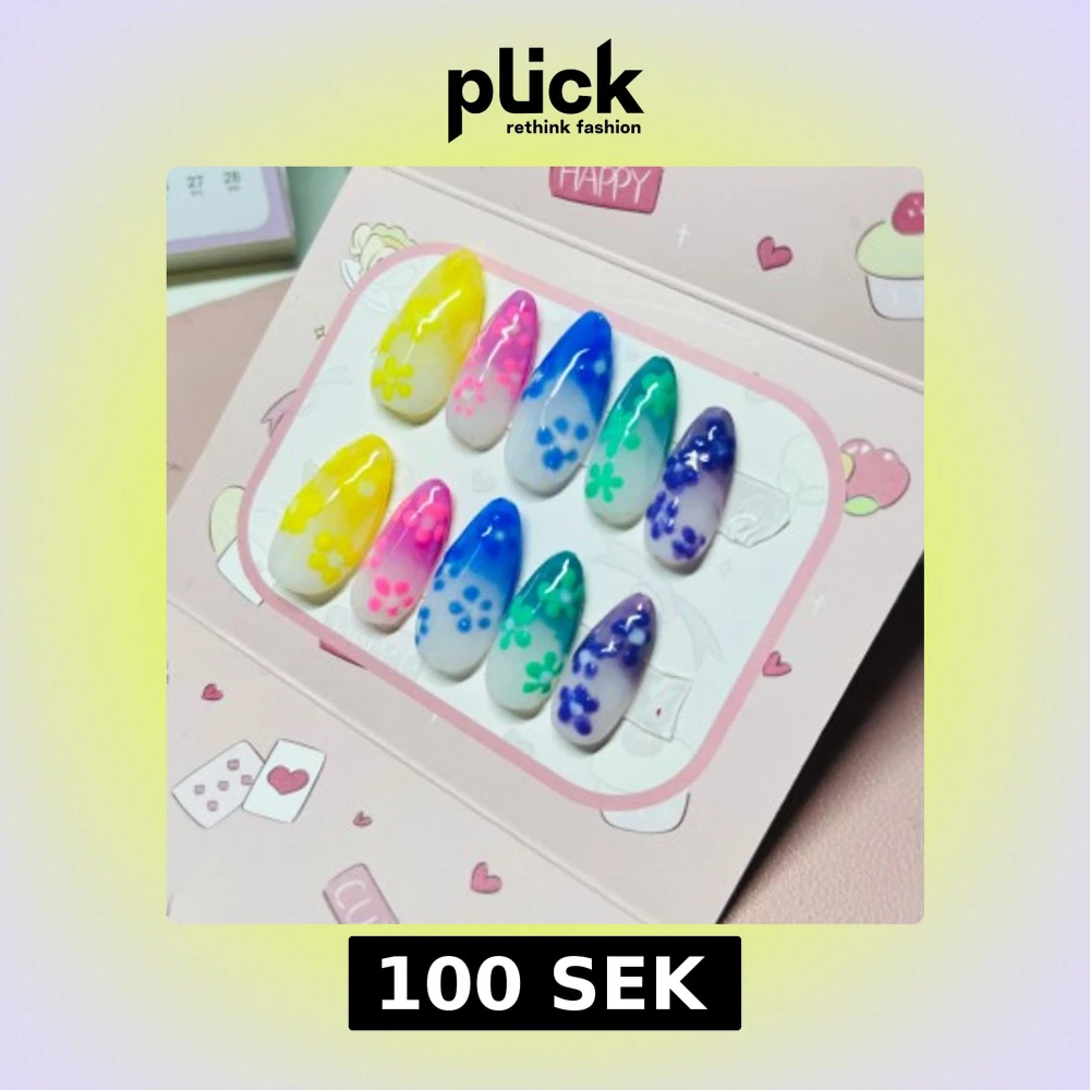 Set med 10 st långa, mandelformade lösnaglar i plast. Naglarna har ombre-effekt i gult, rosa, blått, grönt och lila med söta blommor i matchande färger. Perfekt för dig som vill ha en lekfull och färgstark look på naglarna.