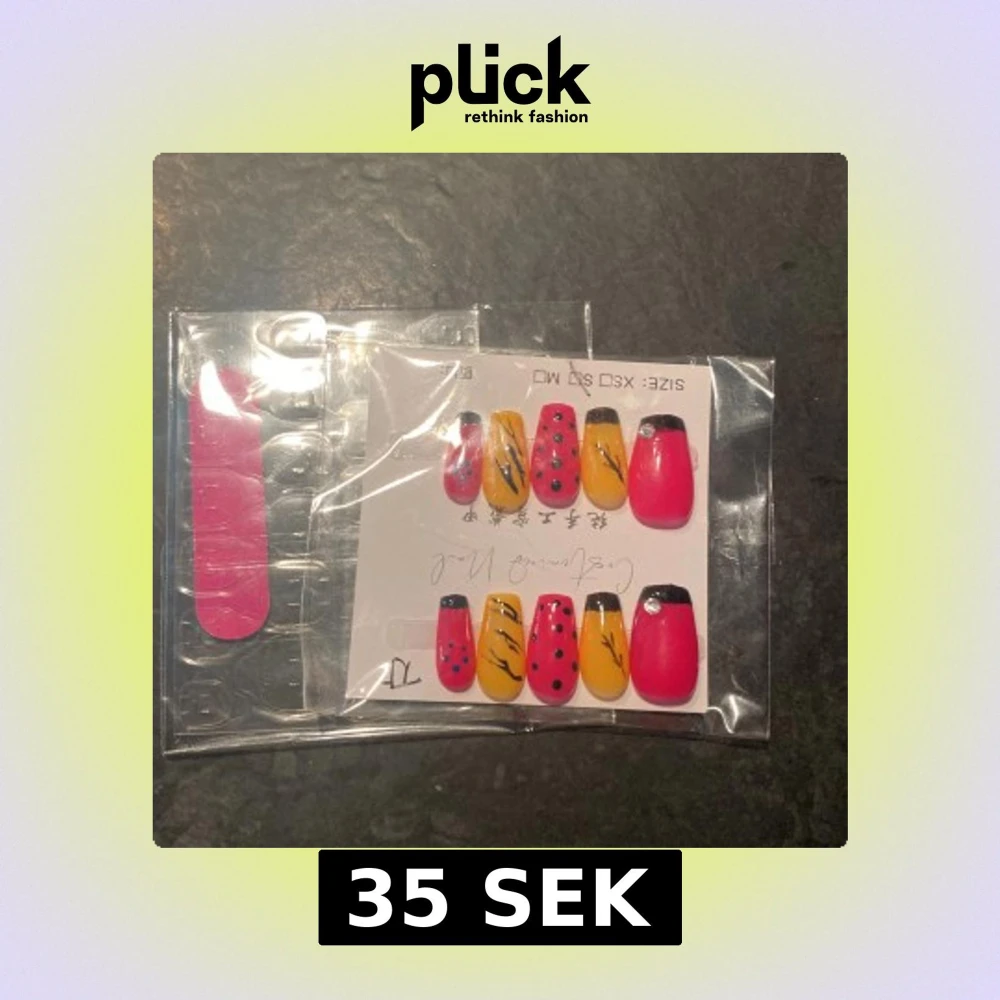 Säljer ett set lösnaglar i starka färger – röd, gul och svart. Naglarna har olika mönster som prickar och linjer. Medföljer gör en rosa nagelfil. Perfekt för dig som vill ha en unik och färgstark look.