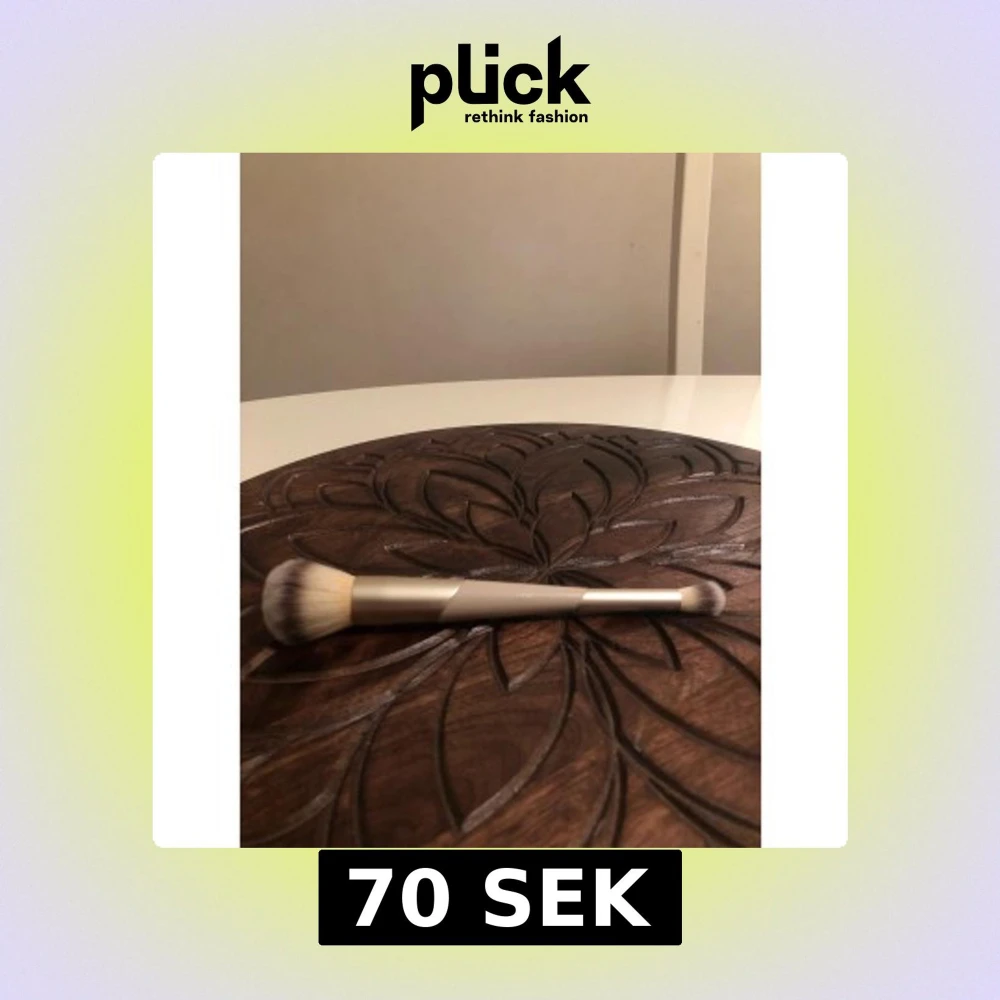 Snygg Flaer - duo sminkborste med två olika borstar, i ena änden en större fluffig borste och i andra änden en mindre rundad borste. Handtaget är beige med guldiga detaljer och borstarna är gjorda av mjuka syntetiska strån. Perfekt för både bas och detaljer.