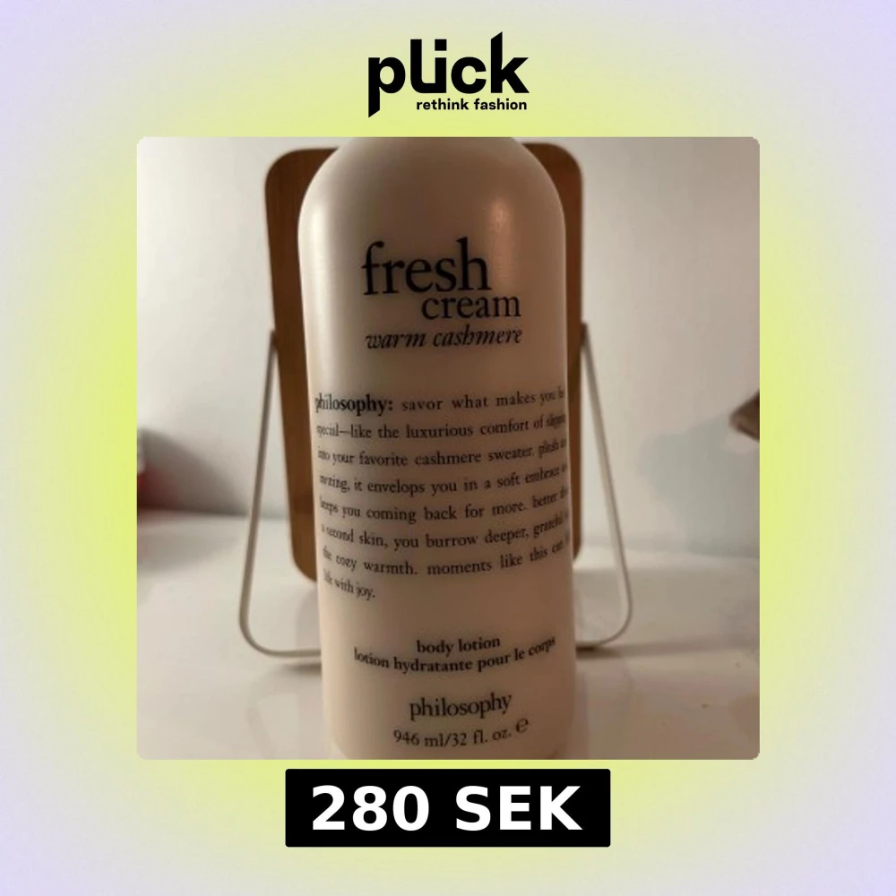 Lyxig body lotion från Philosophy med doften Fresh Cream Warm Cashmere. Flaskan innehåller 946 ml och erbjuder en mjuk och omfamnande känsla, perfekt för att hålla huden återfuktad och doftande av varm kashmir.