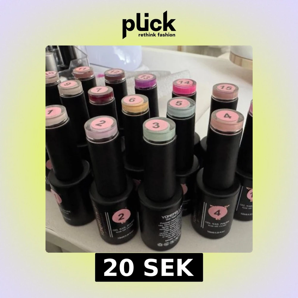 Säljer ett set med 16 flaskor gel nagellack i olika färger, från nude och pastell till stark rosa, lila och röd. Flaskorna är svarta med rosa etiketter och varje färg är numrerad på locket. Perfekt för dig som vill ha många val till naglarna. Perfekt för ny börjare.