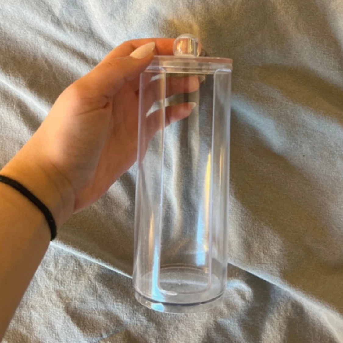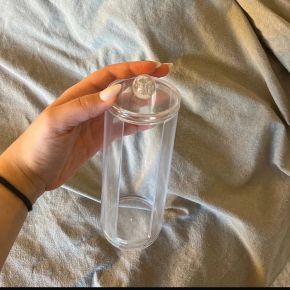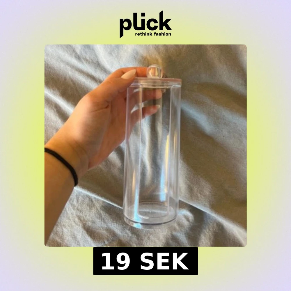 Snygg och praktisk genomskinlig sminkförvaring i plast med rund form och lock med knopp. Perfekt för att organisera sminkborstar, beautyblenders eller läppennor på sminkbordet. Enkel att hålla ren och passar in i alla rum.
