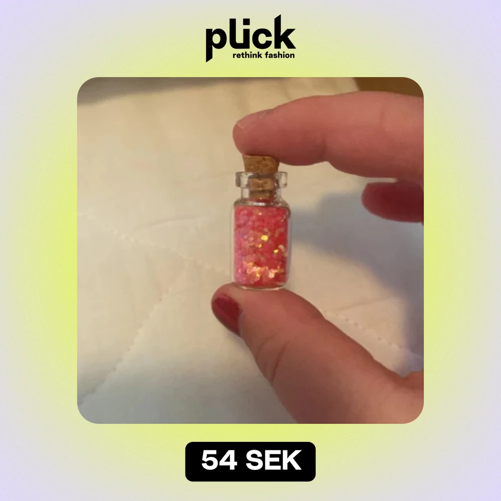En liten glasflaska med kork som innehåller rosa glitter. Glittret har en skimrande effekt med inslag av guld och silver.