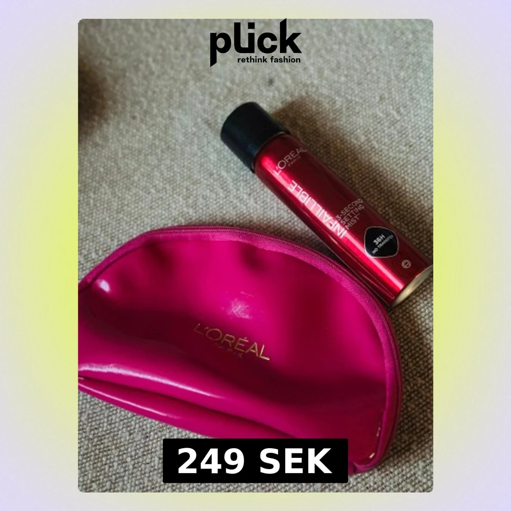 Barely used - L'Oréal Infallible 36H Setting Mist i röd metallisk flaska med svart lock. Medföljer en snygg, glansig sminkväska i ceriserosa med guldfärgad L'Oréal-logga. Perfekt för att fixera sminket och ha allt samlat i väskan.